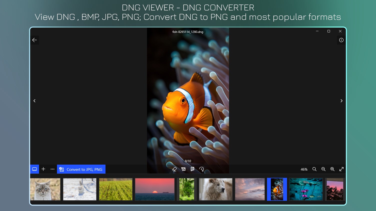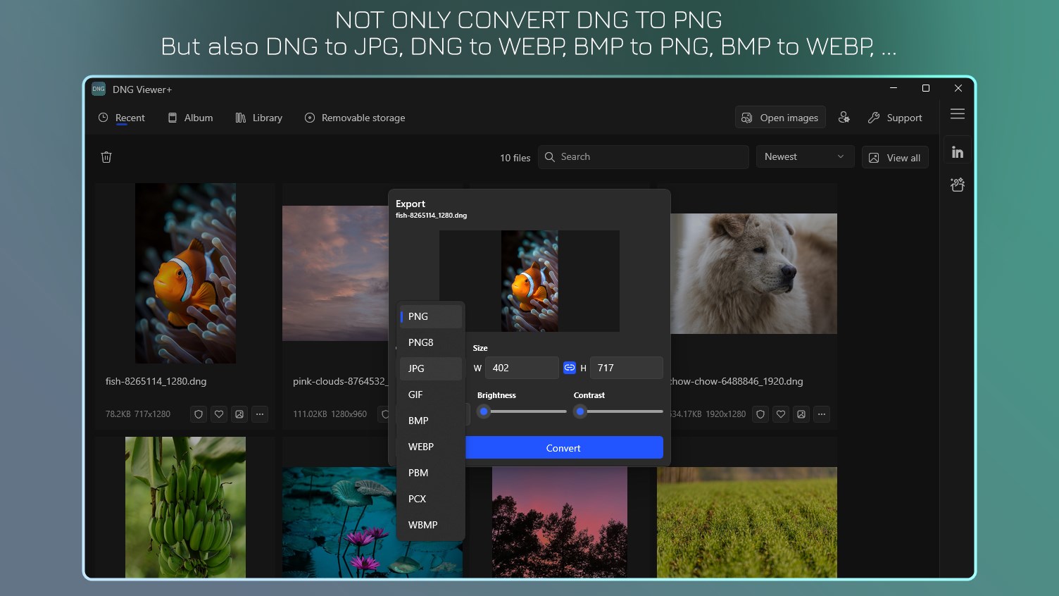 View DNG and popular image formats;Convert DNG to PNG, JPG, BMP;
