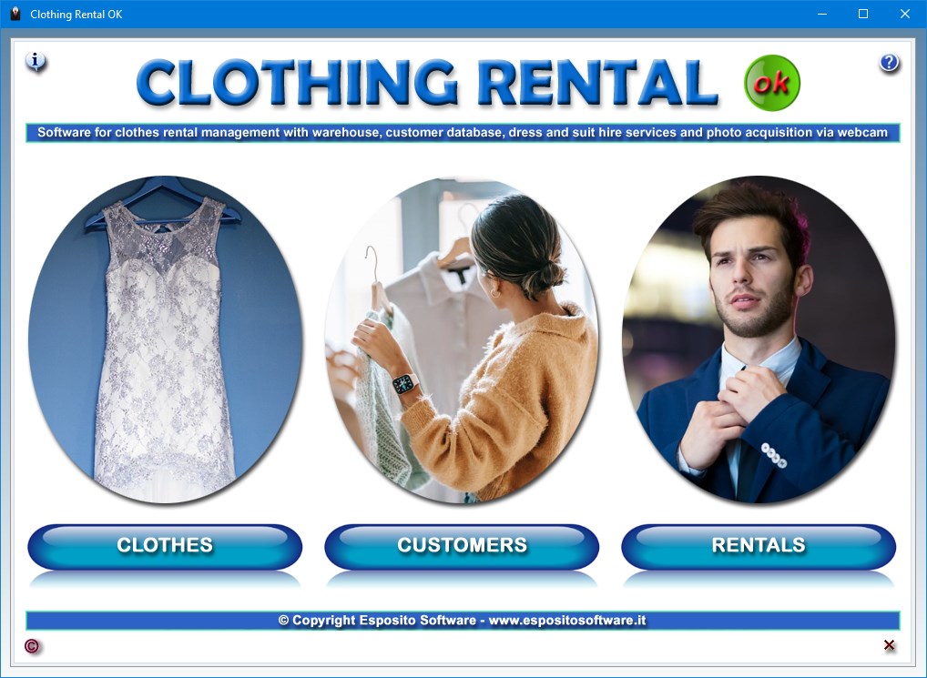 Clothing Rental OK is very user-friendly software that allows you to manage your clothes rental services and keep track of your customer data and the clothes available in your garment rental shop. At any time you can browse clothes by brand, type or style, so you can find the item in your clothing warehouse that best fits the needs of your customer. You can store and manage clothes of all kinds and for all ages, for example, special occasion dresses and suits, wedding dresses, masquerade or carnival dresses, and so on. This software makes available three interacting apps that will provide you with all the features you need to take care of your clothing rental shop. In a few clicks, you will be able to manage the delivery of the suit or dress to the customer and its return at the end of the rental period.