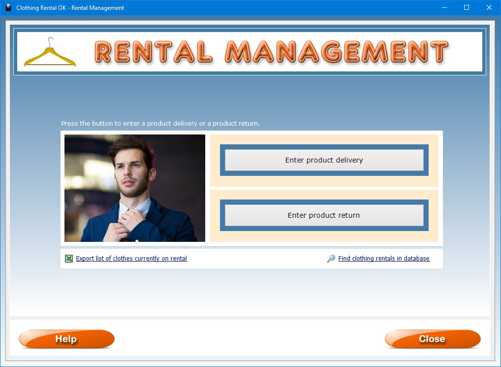 The Rental Management app is the environment where you can record clothing deliveries and returns, as well as get reports on all clothing rentals made by your store and export the list of clothes currently on rental to a Microsoft Excel file.