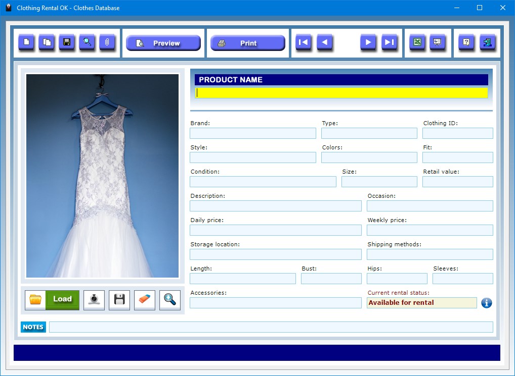 The data to indicate concern the product name, brand, type, clothing ID, style, colors, fit, condition, size, retail value, description, occasion, daily and weekly rental prices, storage location, shipping methods, length of the dress or suit, the measurements of the bust, hips and sleeves that the dress or suit fits, the accessories supplied with the rented product, and any further notes.