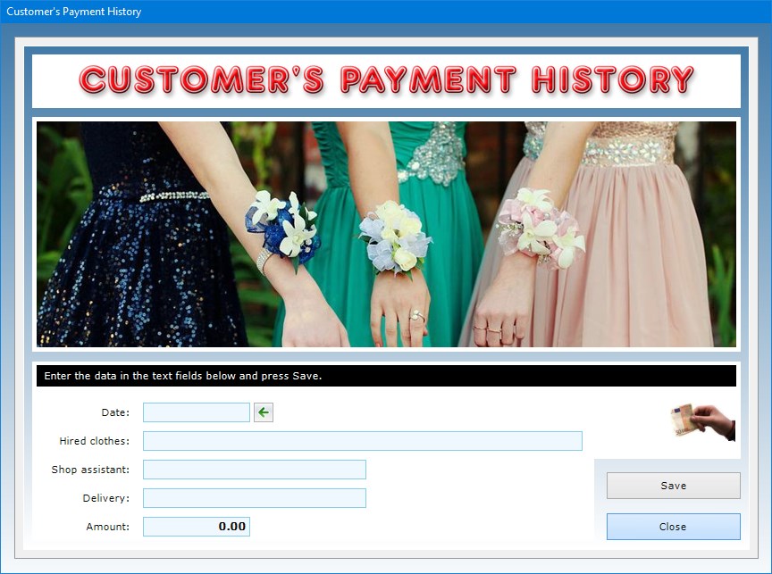 After saving the record, pressing the Payment History button gives you access to a window where you can list and print all payments made by the customer to your clothing rental shop for the suits or dresses he or she hired. For each payment you must indicate the date, a description of the hired clothes, the name of the shop assistant who served the customer, the product delivery method, and the amount paid.