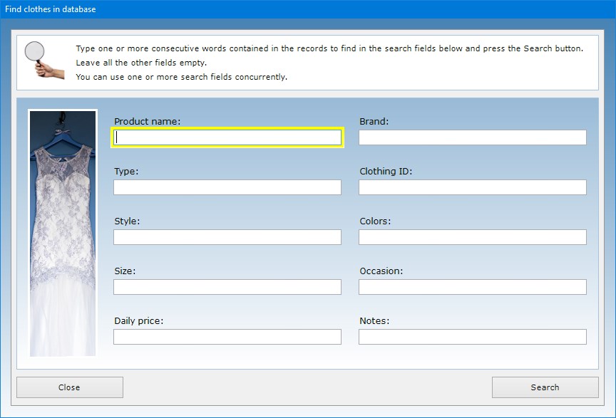 The Attached Files function allows you to attach three files of any kind to each record which could contain, for example, additional photos of the dress or suit from different perspectives.