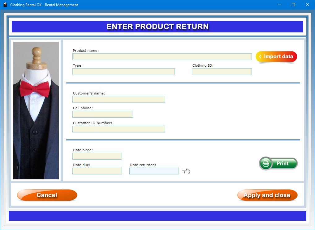 To store a clothing return, press the Enter product return button and, in the window that appears, click on Import data to view the complete list of all clothes out on rental. At this point, you can double-click on the dress or suit to be returned in order to recall its data, enter the return date of the clothes in the appropriate text box and, finally, press Apply and close. Also in this case, if you wish, you can print a product return reminder by using the Print button before pressing Apply and close. After you have stored the clothing return, the contents of the "Current rental status" text field for that record in the clothes database will automatically change to "Available for rental".