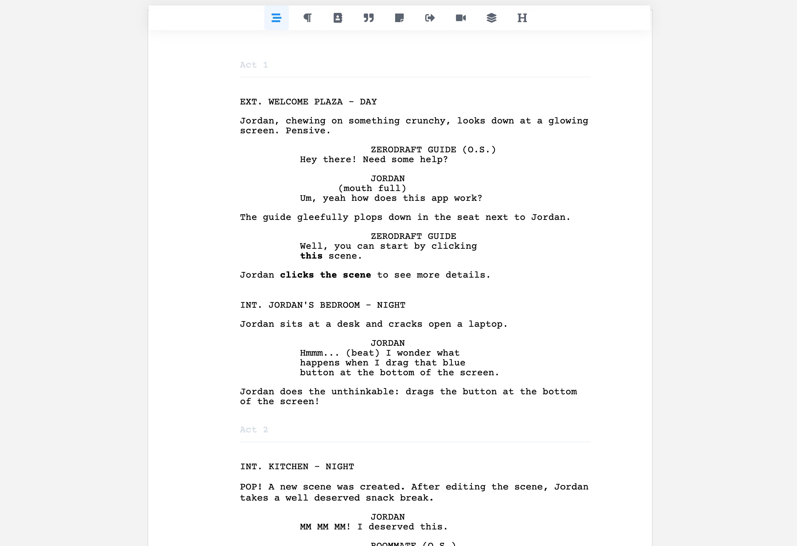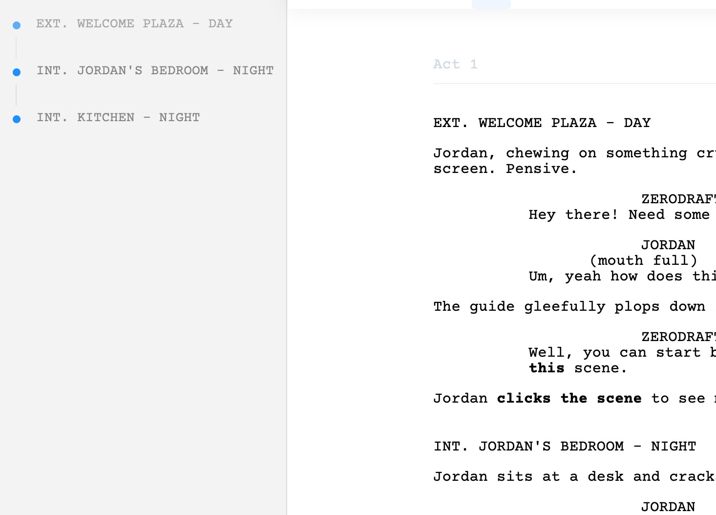 Whether you're a beginner or an experienced screenwriter, ZeroDraft provides everything you need to turn your story idea into a professional screenplay as quickly as possible. Unlike other screenwriting apps, ZeroDraft doesn't add unnecessary views and widgets you'd never use.