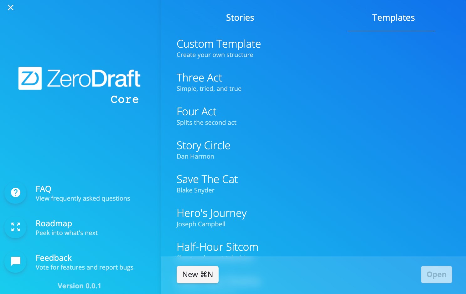 ZeroDraft is optimized for structured writing. Start a screenplay using well known plot outlines such as Dan Harmon's "Story Circle", Blake Snyder's "Save the Cat", Joseph Campbell's "Hero's Journey", or a custom structure of your choosing!