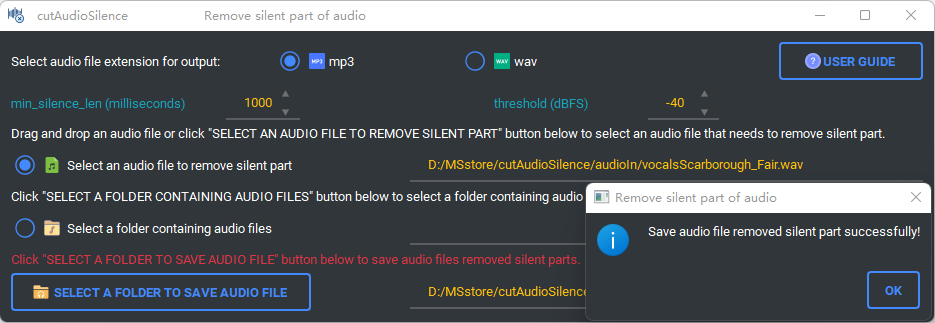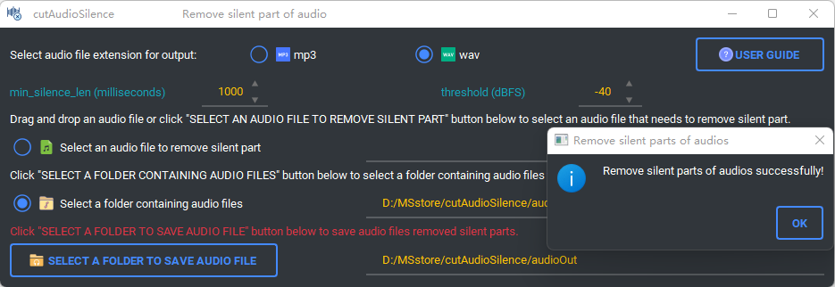 (5) Click "SELECT A FOLDER TO SAVE AUDIO FILE" button below to save audio files removed silent parts. The filename is the original audio filename plus a timestamp (year, month, day, hour, minute, second).