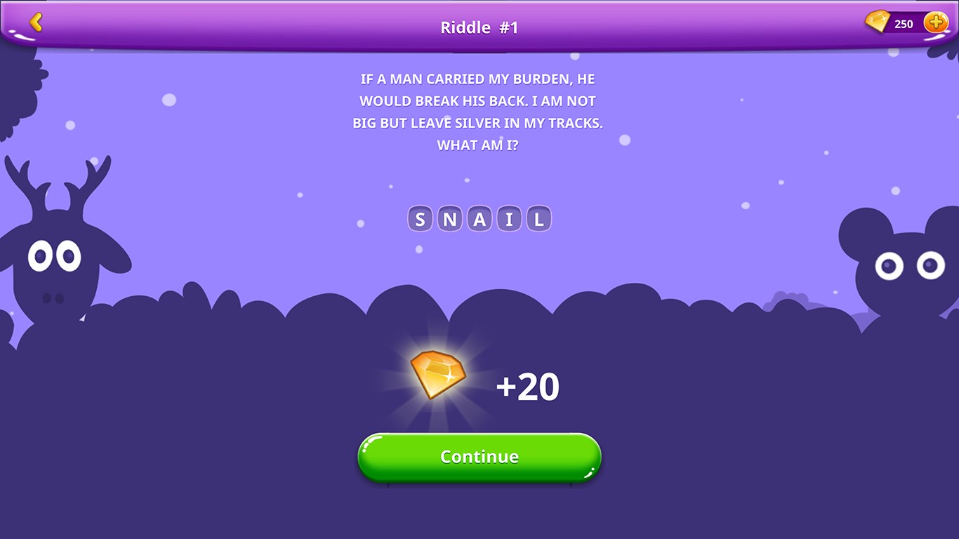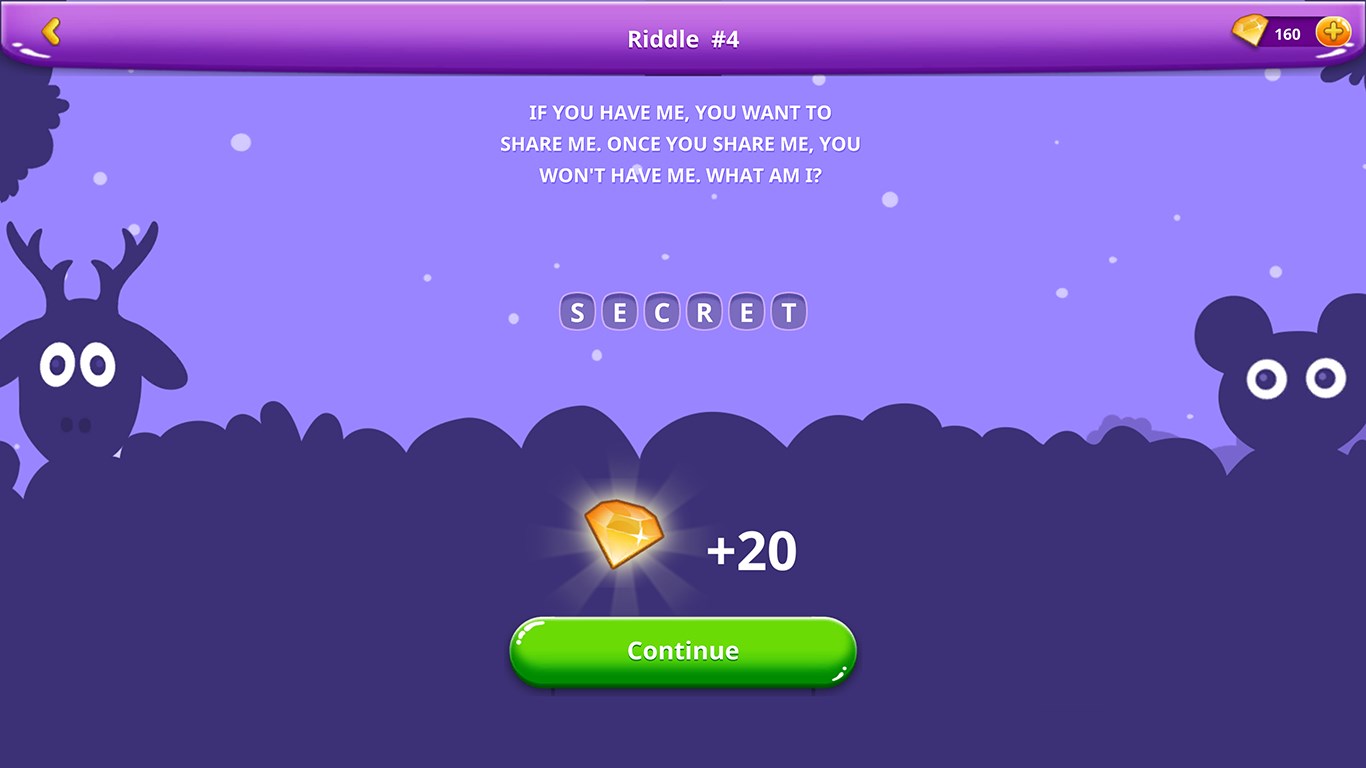 - HINTS AS HELP: if you get stuck trying to find an answer to some of the difficult riddles, you can use a hint and get to the solution faster