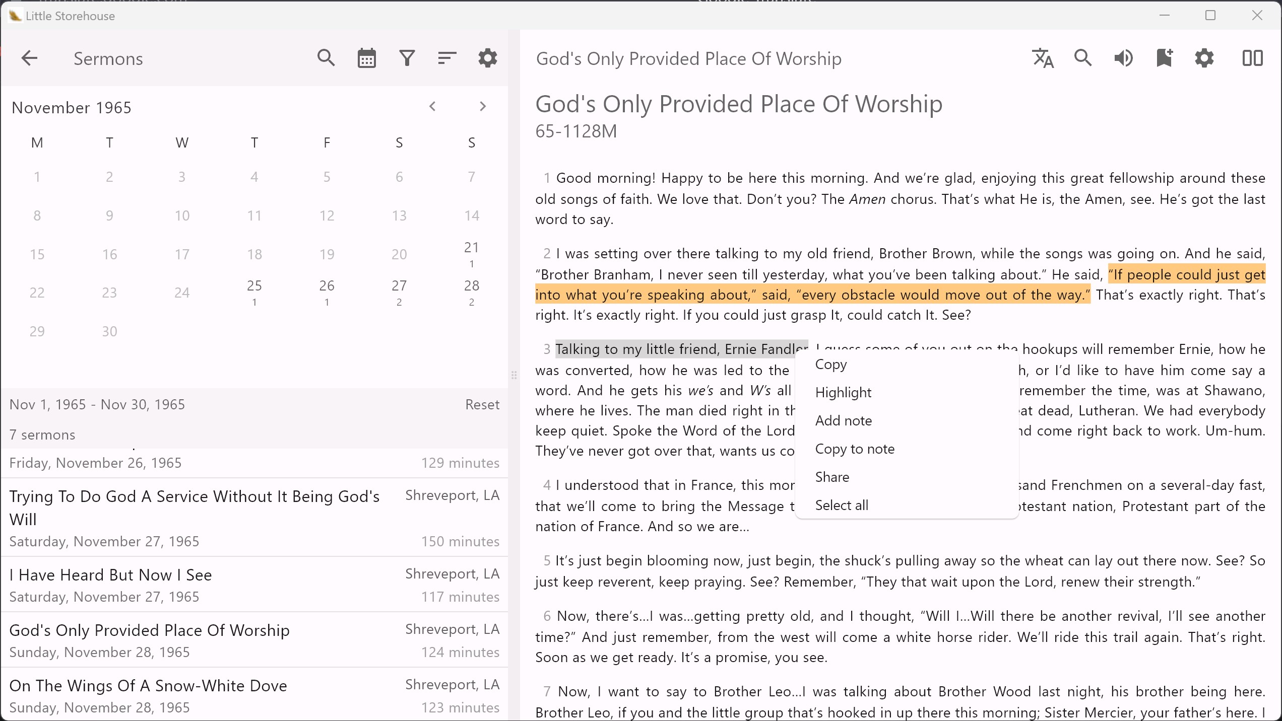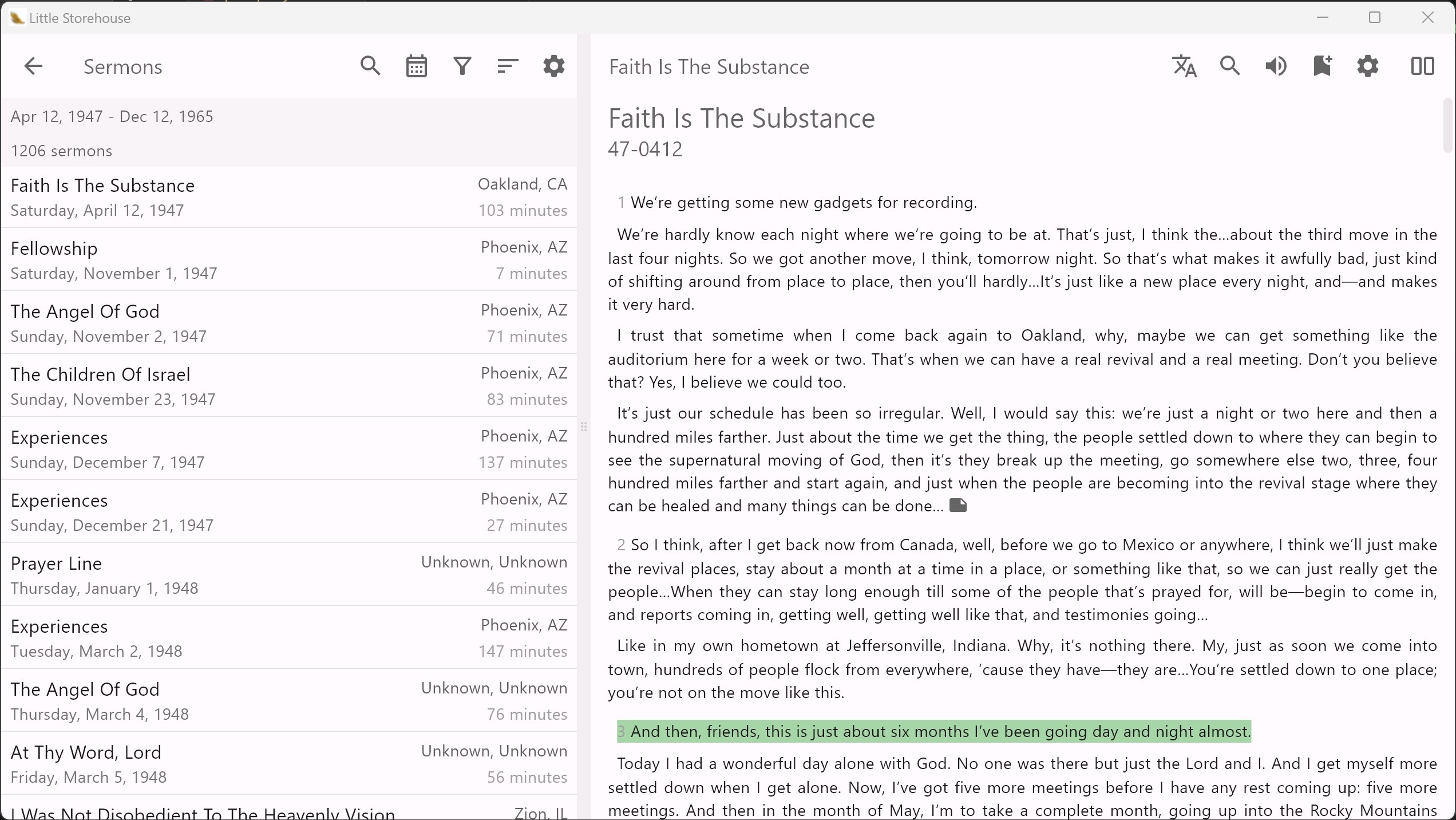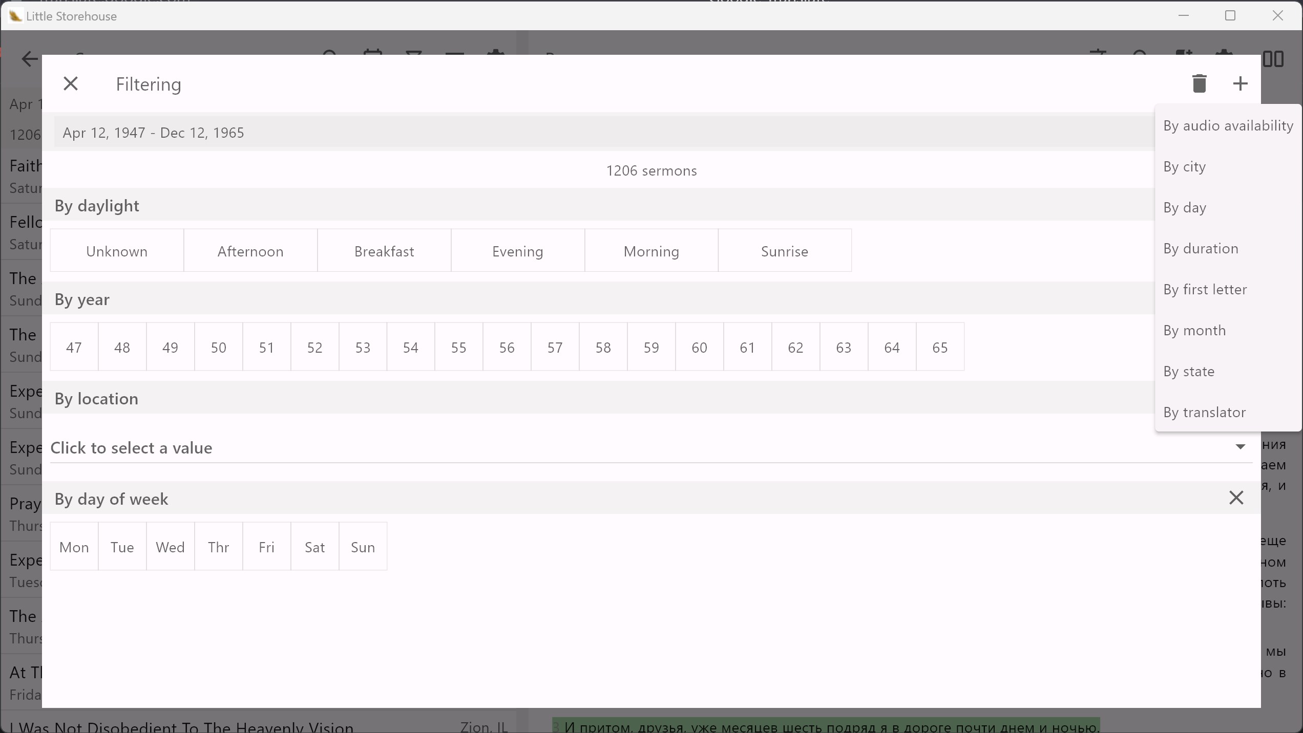 The application offers rich filtering of sermons by date and many other parameters.