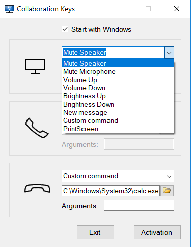 The Collaboration Keys application was designed for collaboration keyboard keys usage with some Hewlett Packard computers. Having installed the application you may assign the action to corresponding keyboard keys. The list of available actions is: Mute Speaker, Mute Microphone, Volume Up, Volume Down, Brightness Up, Brightness Down, New message, Custom command, PrintScreen.