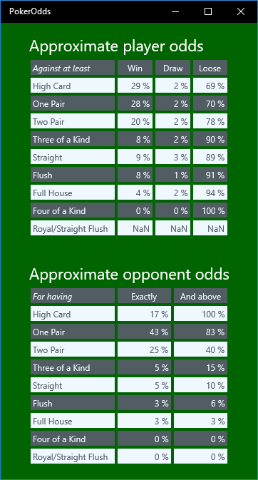 Calculations process takes around fifteen seconds, generally based on a limited number of simulations for roughly +/- 6% results accuracy. In some rare cases the calculations are done considering all dealing possibilities.