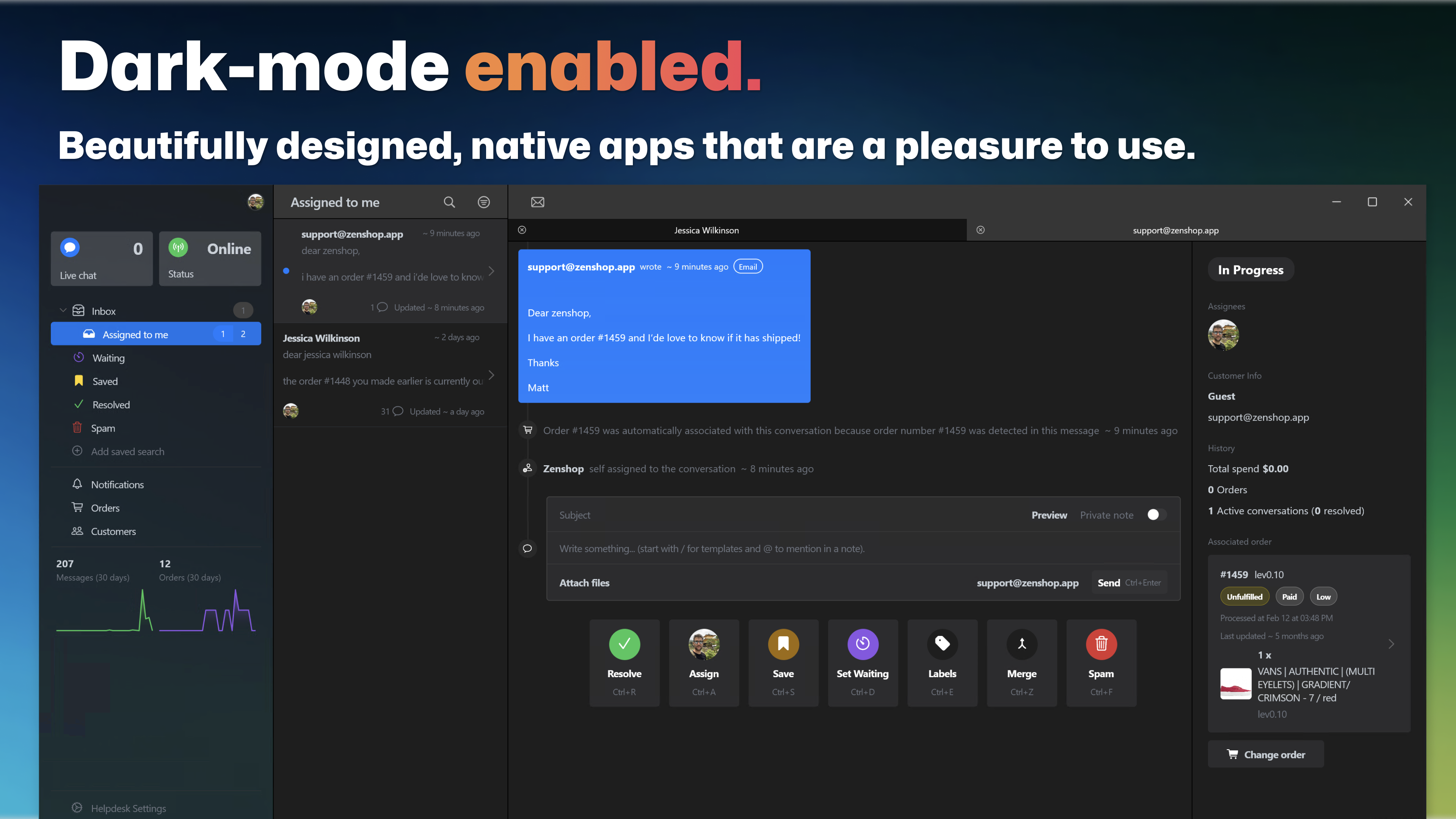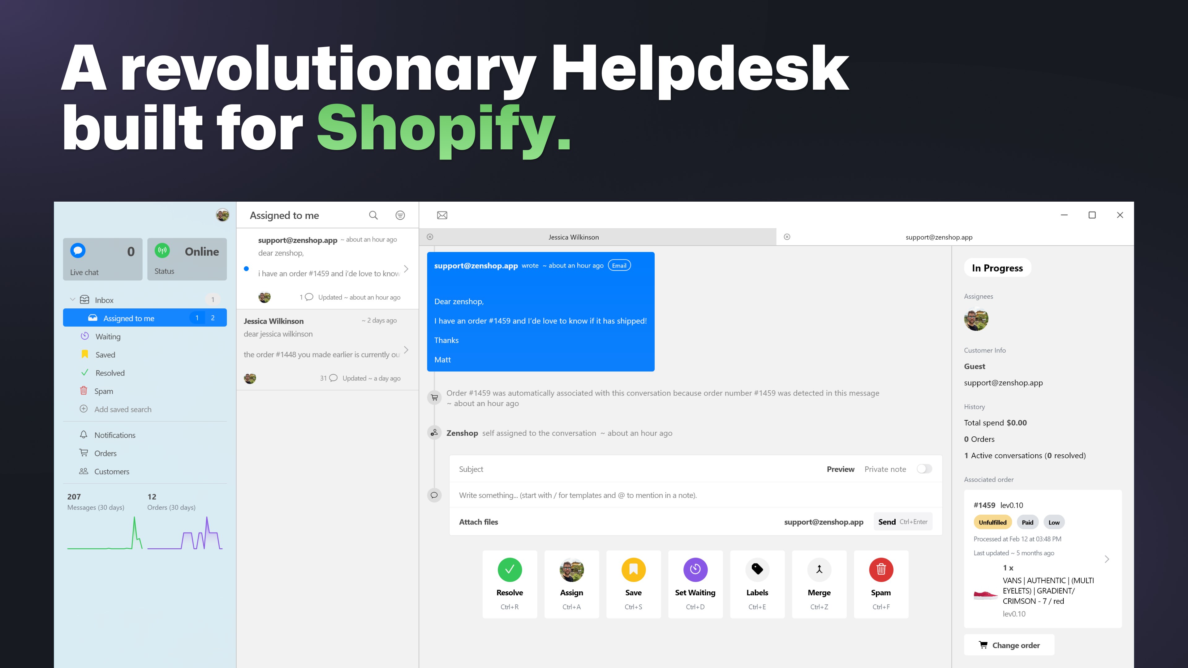 Take your Shopify store to the next level for your customers and use zenshop to handle all your customer questions. With a shared mailbox, zenshop Helpdesk and beautifully crafted mobile and desktop apps, you can provide the best experience for your customers, with tools your support team will love to use.