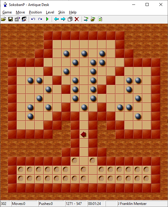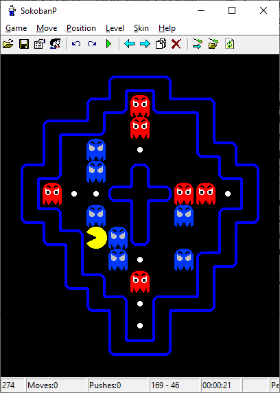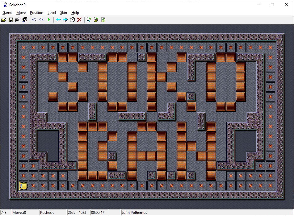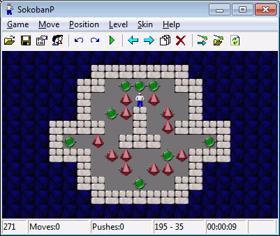 It's an old well known Japanese game sometimes known as a warehouse keeper. You push boxes to marked places. This game has 30 skins and 8000 levels which can be played in any order. All your solutions are saved to the disk and can be replayed later. You can save your position at any time or undo any number of moves. The player can move to 8 directions by numeric keys. The right mouse button quickly moves player to any position. The left mouse button is used to push a box to any reachable destination (the shortest path is found). You can use the level editor to create your own levels. You can create more skins.