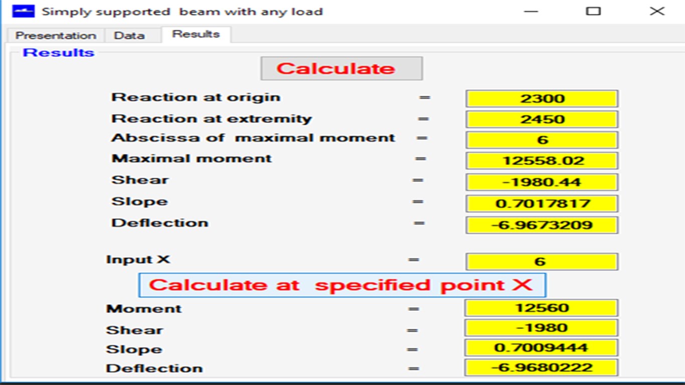 This application is intended to calculate reactions at extremities, moment, shear, slope and deflection at any specified point along a simply supported beam of uniform cross section. Distributed loads,trapezoidal loads, point loads, applied moments or combinations of all these loads may be modeled by using the principle of superposition. Complicated beams with multiple loads can be analyzed with homogeneous units.