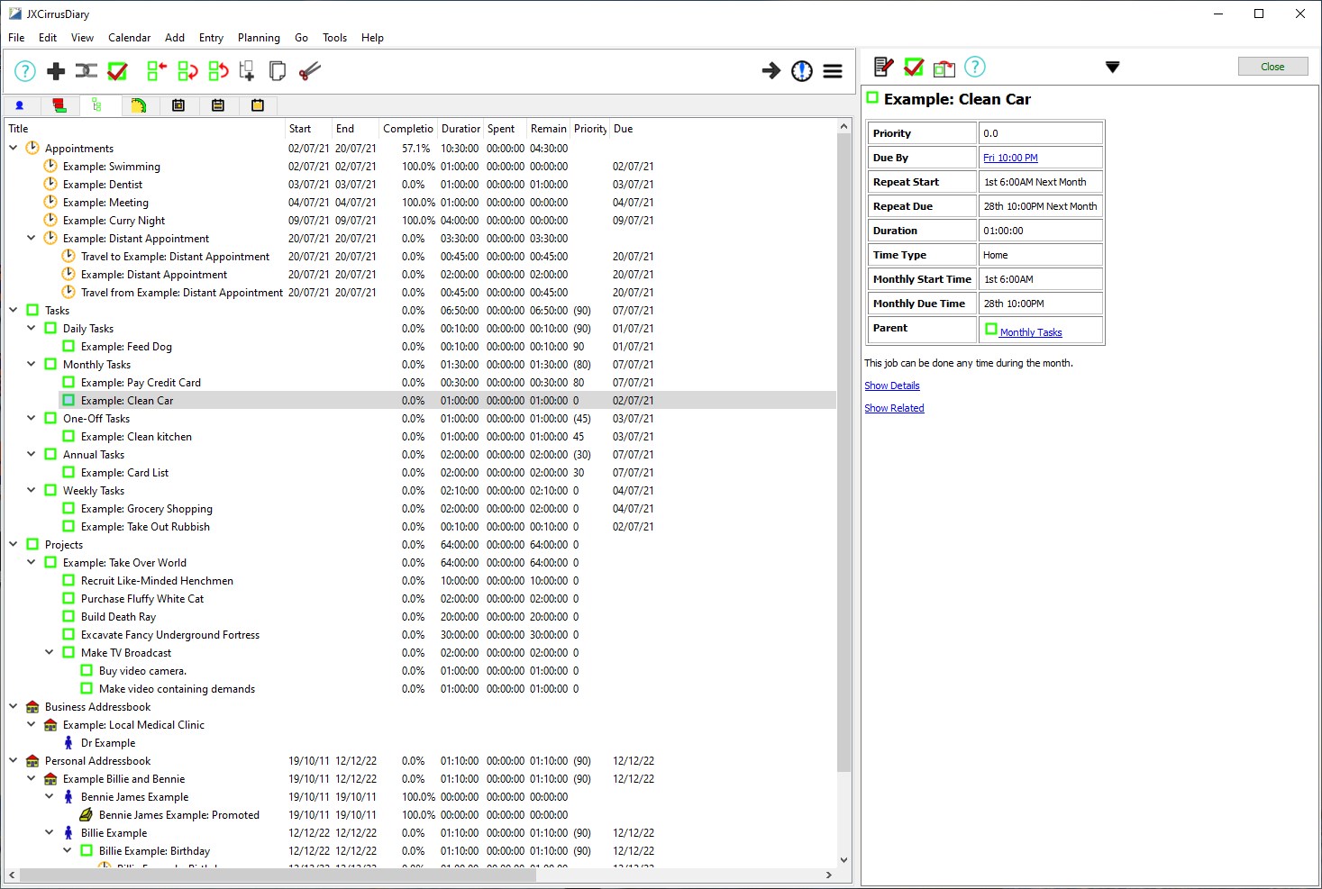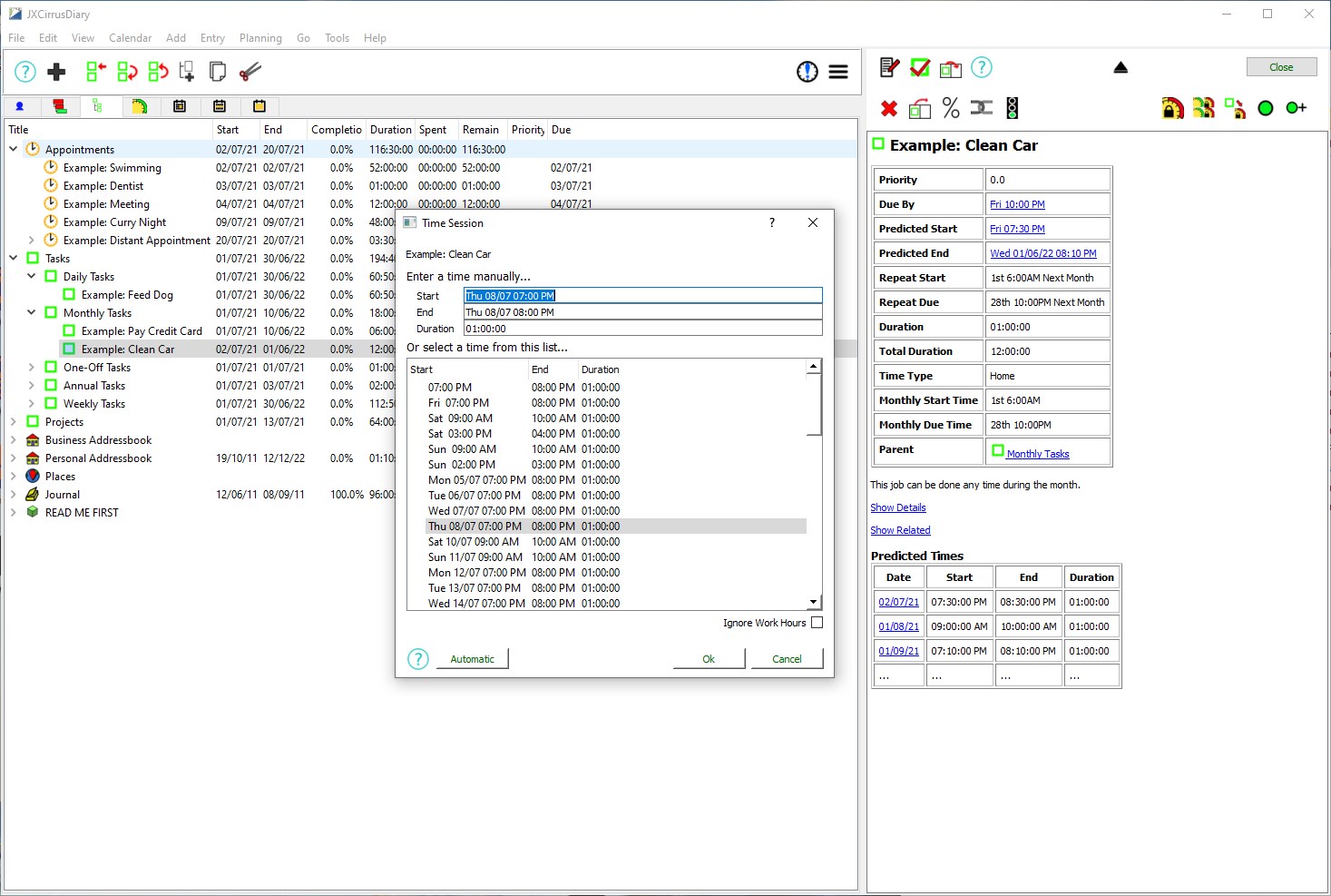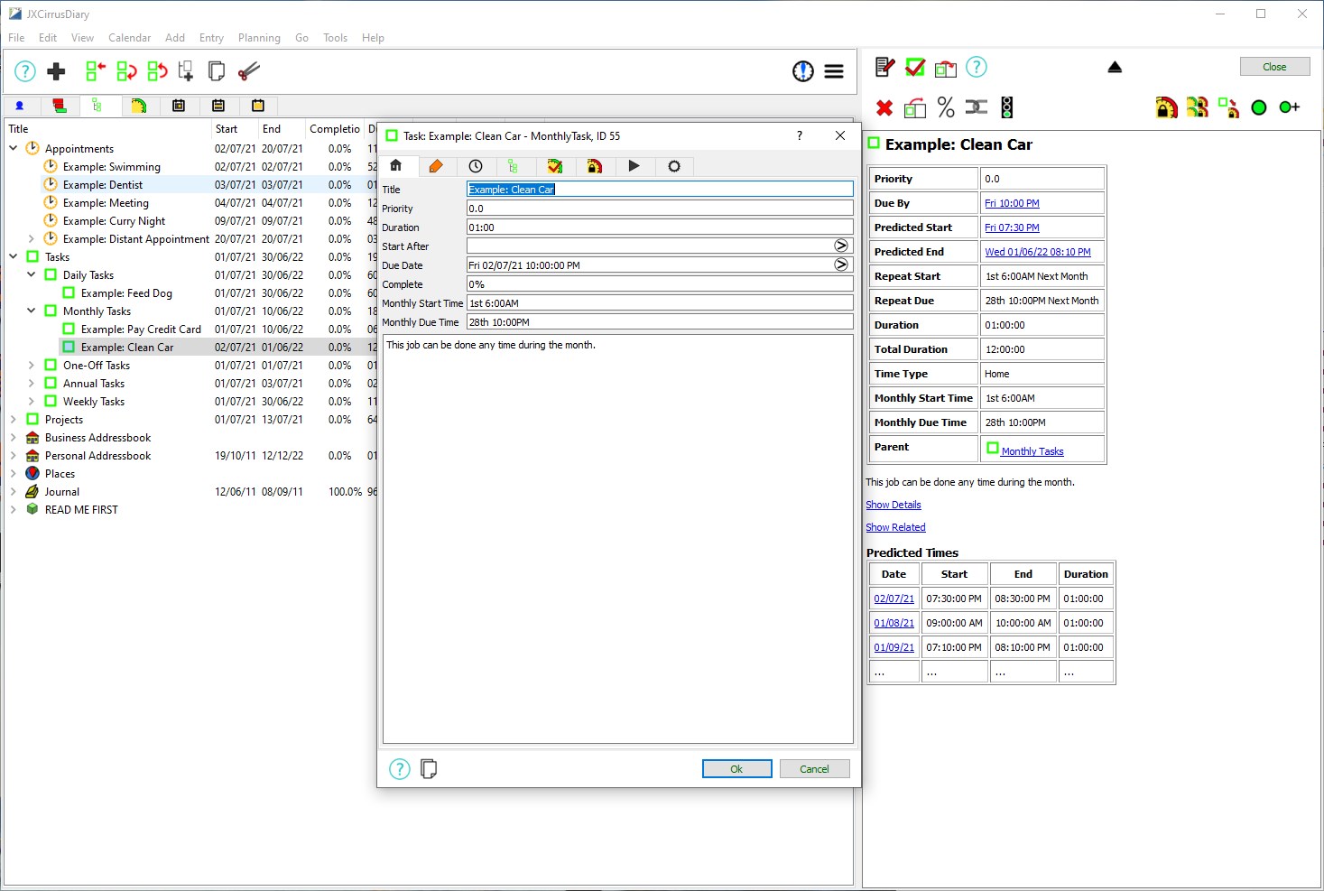 At its most basic, JXCirrus Diary is a combination of calendar, to-do list, addressbook and journal. You can enter your list of jobs for the week, and tick them off as you finish them. It is nice and quick to enter the information, and JXCirrus Diary will warn you when tasks or appointments are due. But hidden under the surface are some far more powerful features...