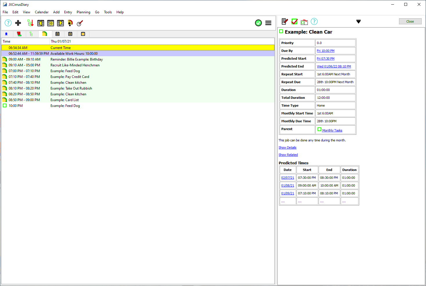 Enter your calendar and your to-do list, and JXCirrus Diary will fit them altogether into a complete plan for the next 9 months. It will try to make sure tasks are finished by their due date, and high priority tasks are finished first. Once it has this plan, it can tell you whether you can fit everything in, and what you ought to work on first.