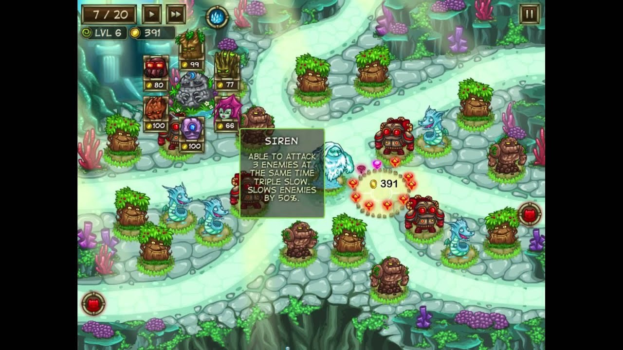 Keeper Of The Grove 3 is a tower defense strategy game. Your job is to guard the precious gems and keep enemy creeps from trying to steal them. Build defensive turrets around the path so they will automatically defend the map so nothing will get stolen. Also you should try to upgrade them in order to become more efficient in combat. You can call a wave earlier in order to receive a bonus for that. Collect all the coins with your mouse and build more defensive turrets.