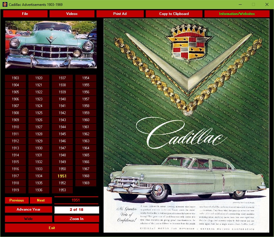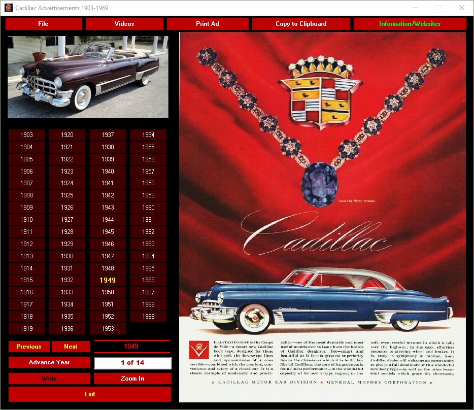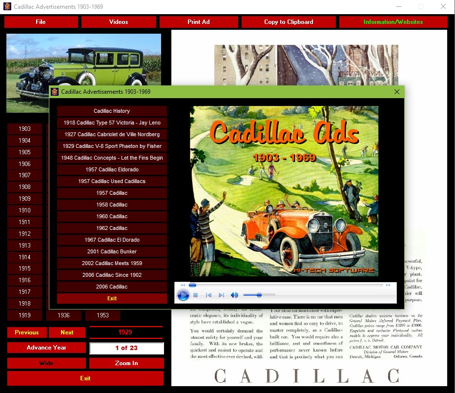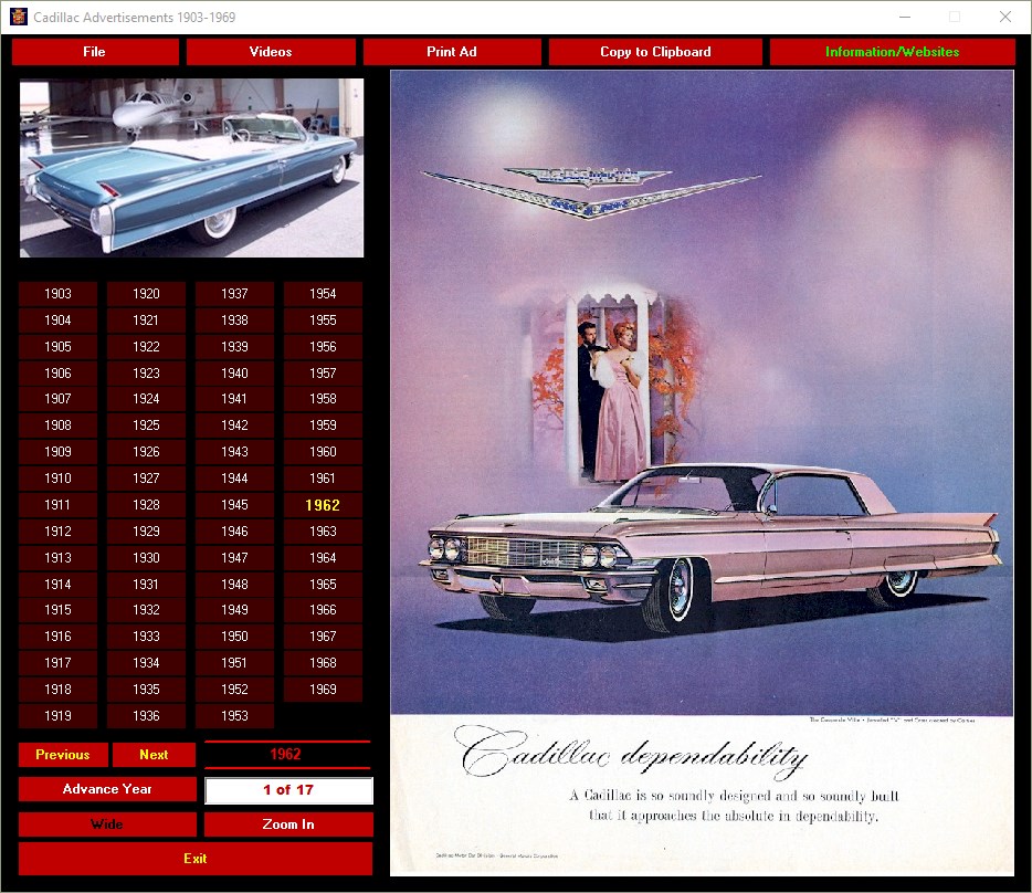 Cadillac Ads of the 1903-1969. Take a nostalgic tour through history. Experience the style and hype of the automobile advertising industry from the glory days of cars. This multimedia title includes over 800 Cadillac magazine ads as they appeared during the period. They're all here: Eldorado, Fleetwood, Coupe DeVille and other models. PLUS 16 TV commercials. This is the largest collection of the Cadillac ads available in a single resource.