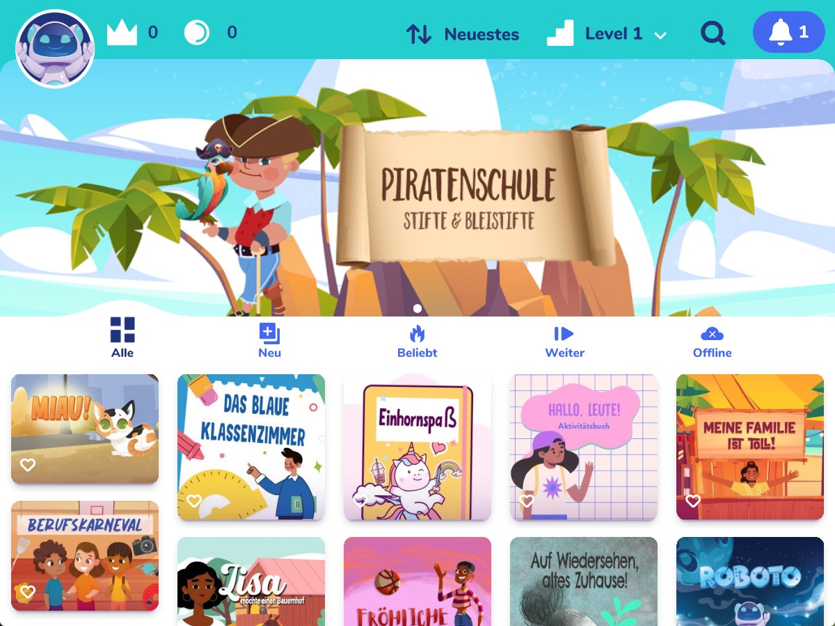 Ja, BOOKR Class ist eine ständig wachsende Bibliothek. Daher fügen wir regelmäßig neue deutsche Bücher und Spiele für jedes der neun Sprachniveaus hinzu.