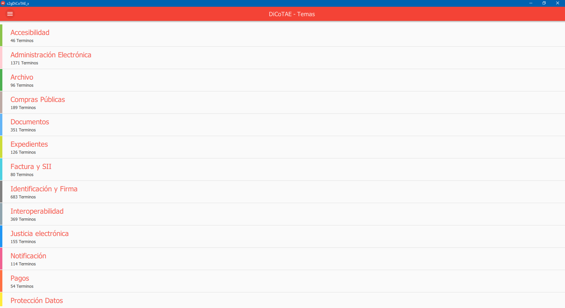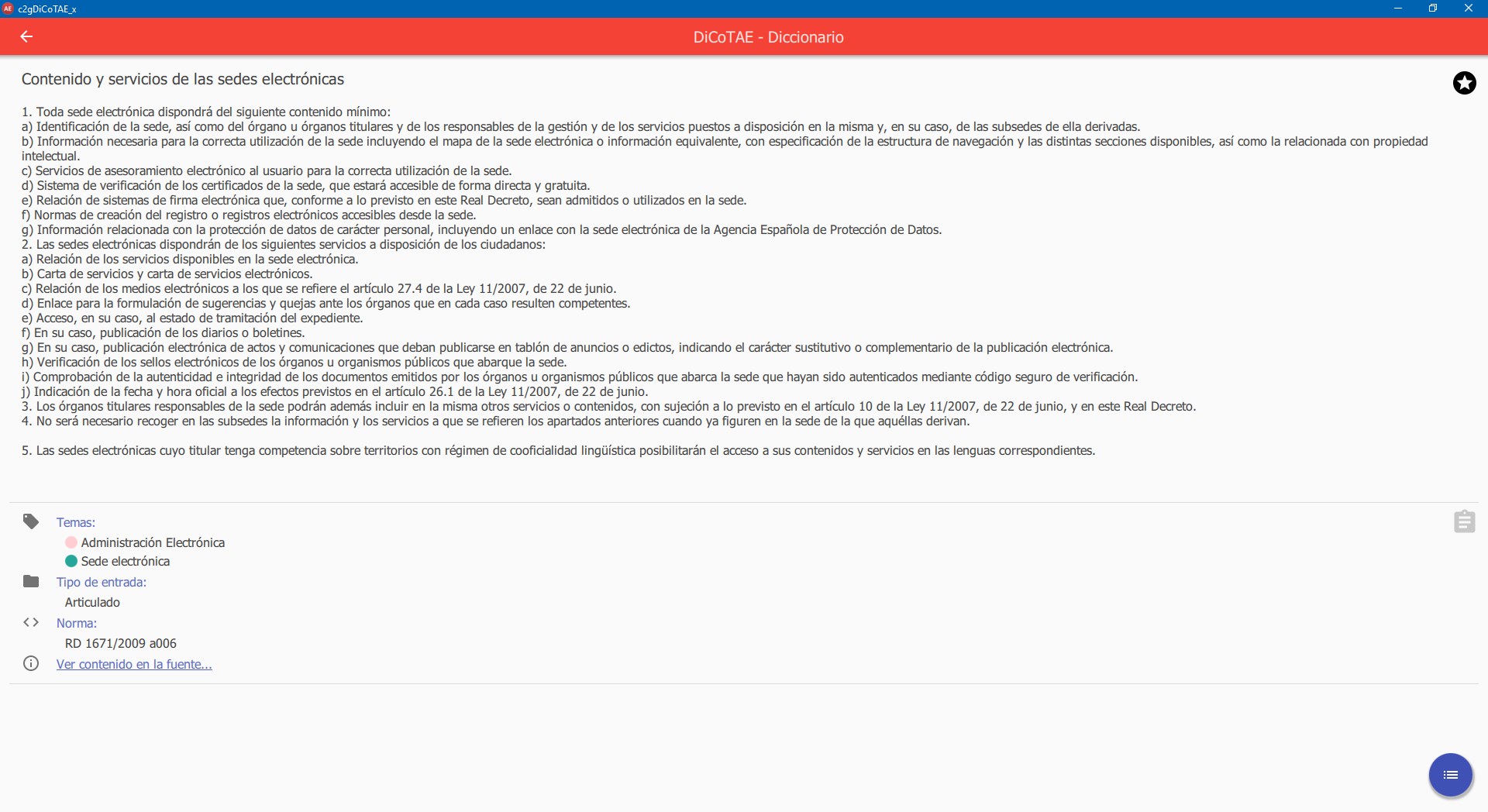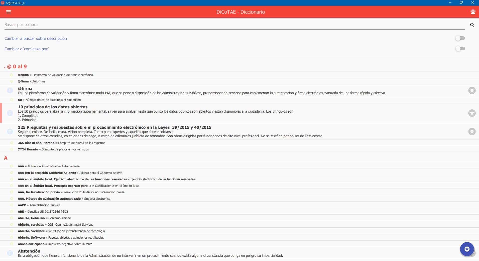 La APP denominada DiCoTAE del Diccionario sobre normativa AE española en la versión de marzo 2019 (build 15) está dirigida:Al lector novicio no iniciado en la Administración por vía Electrónica así como al experto.Al lector con preparación de letras y al de ciencias. Al profesional de la gestión y al tecnólogo.Al que quiere encontrar algo preciso y al que quiere conocer los límites del todo sin una búsqueda concreta. Este último desea conocer el alcance de la AE y descubrir sus lindes.Al que le interesan los artículos de las normas y a aquellos que quieren conocer términos técnicos - servicios - normativa técnica - instituciones con capacidad normativa o de ejecución en AE.Al legislador - jurista - investigador hispanoamericano que pueda tomar elementos como referencia.Obra personal y APP del autor realizada sin ánimo de lucro. No es intrusiva y no requiere de permisos ni de comunicaciones.Se ofrece \'tal cuál\' sin responsabilidad en contenidos y funcionamiento.Actualizada