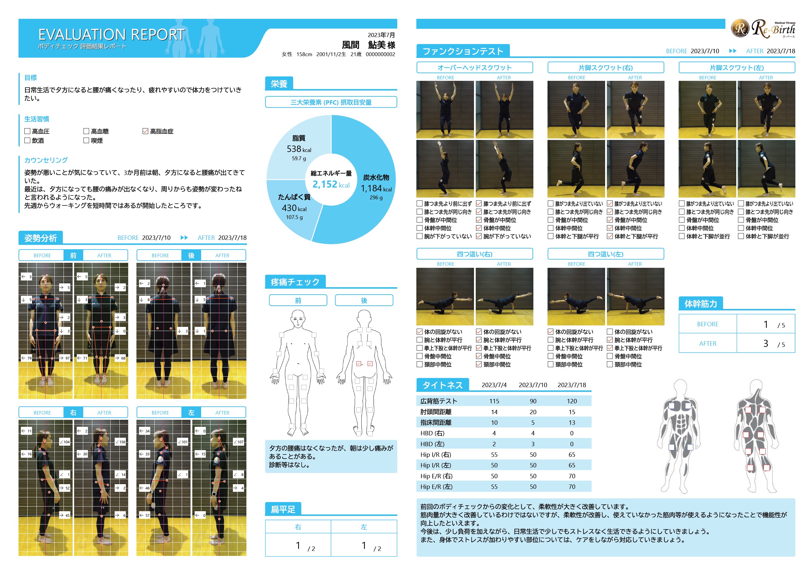 ・目標、生活習慣、カウンセリング、総エネルギー量、疼痛情報、扁平足情報などを入力することにより、評価結果レポートとして印刷してお客様にお渡しできます (A3サイズ)。