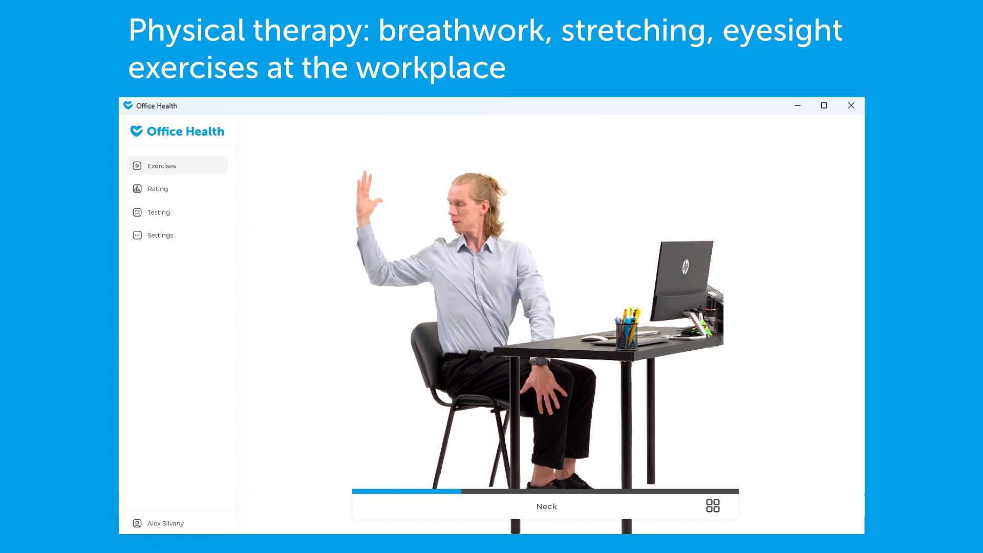 Step 3. "Office Health" provides a personalized set of exercises for each employee, demonstrating how to perform body, eye, and breathing exercises correctly at their workstation