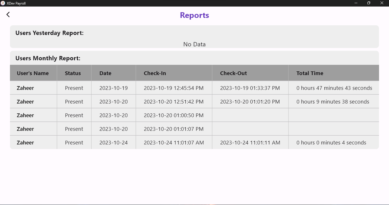 XDev Payroll provides businesses to moniter their employees check-in and check-out timings by providing a monthly and daily report to the admin.