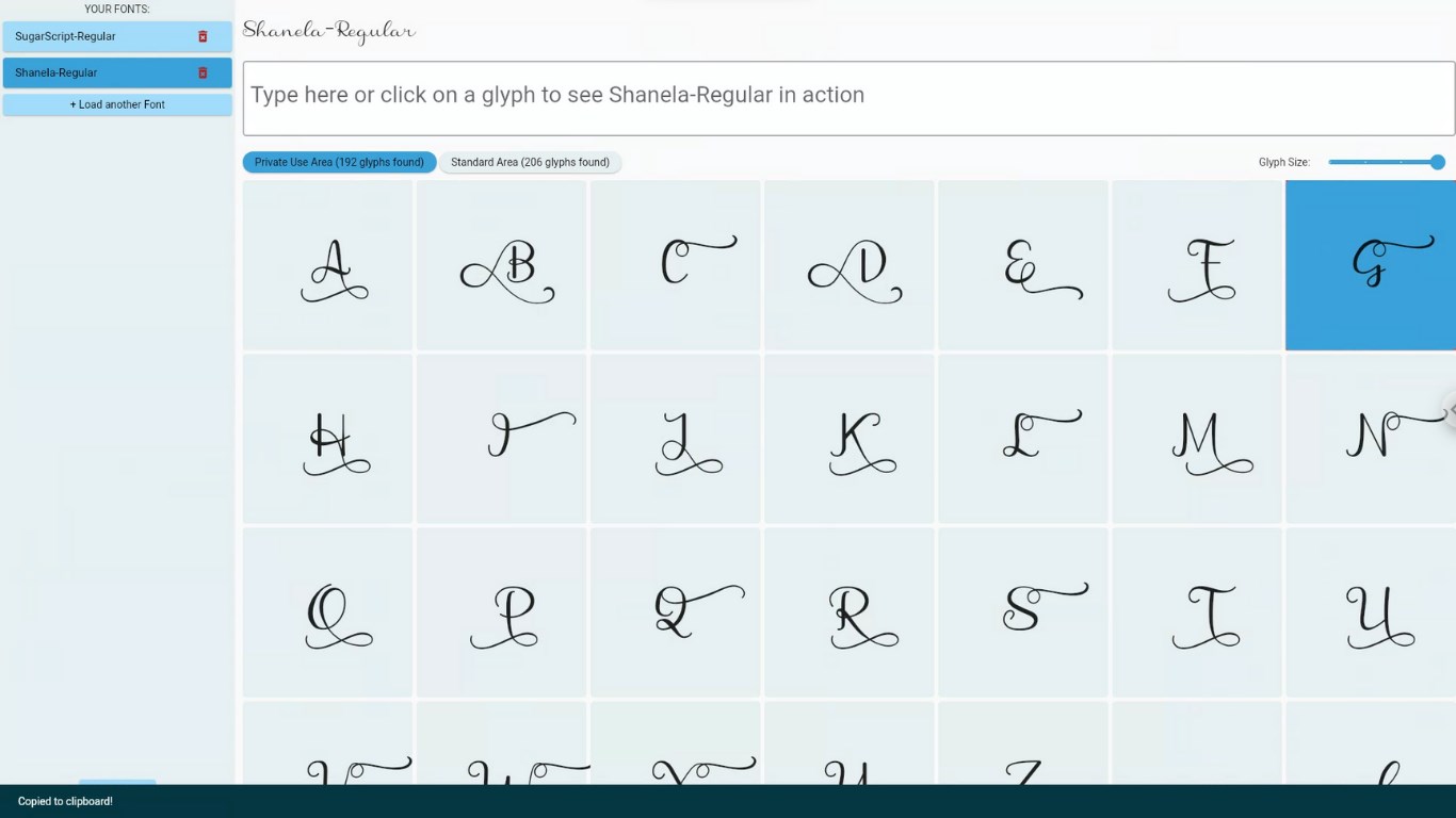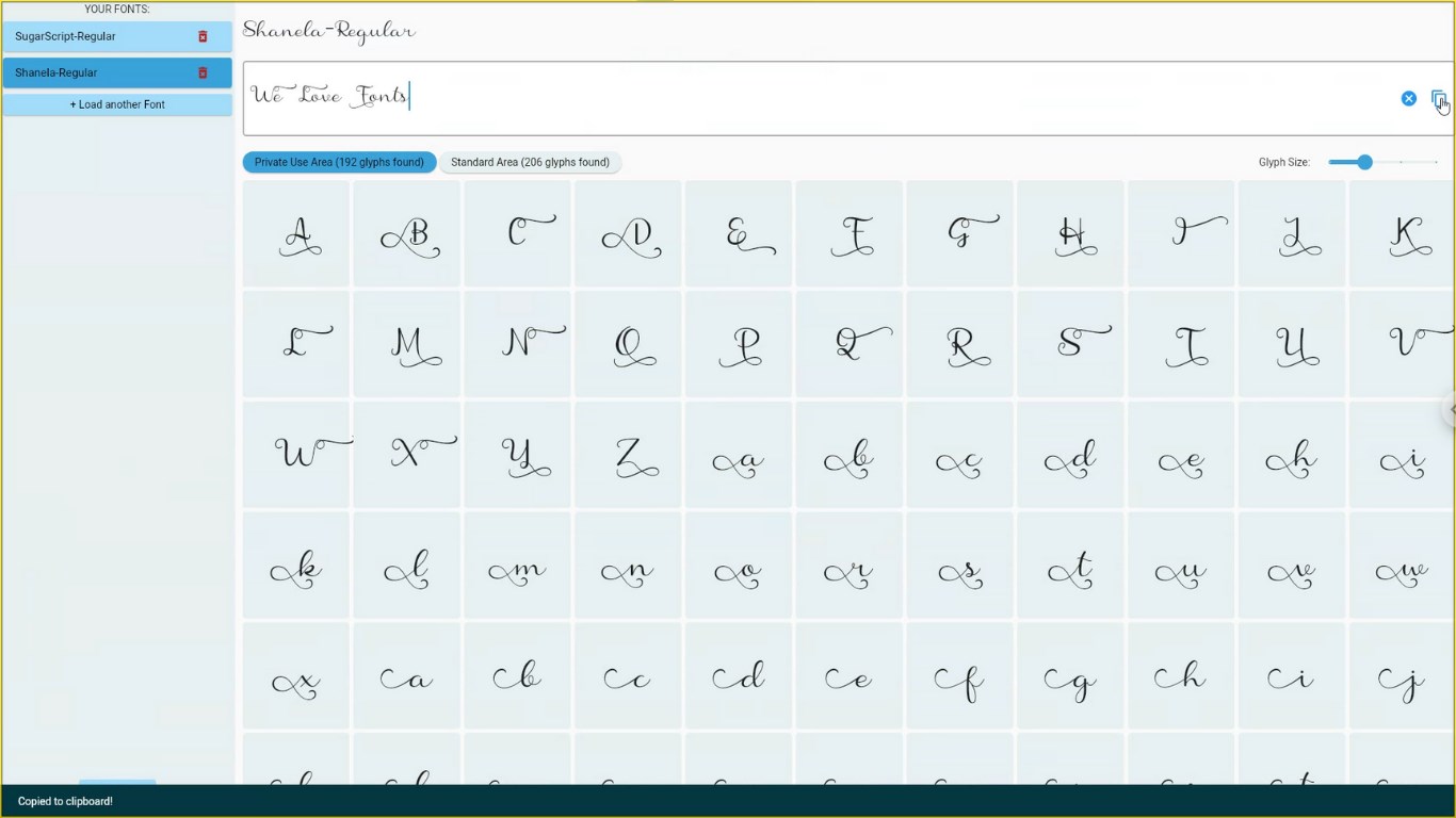 Preview glyphs and standard font characters together before copying into your favourite design software like Canva or Cricut.