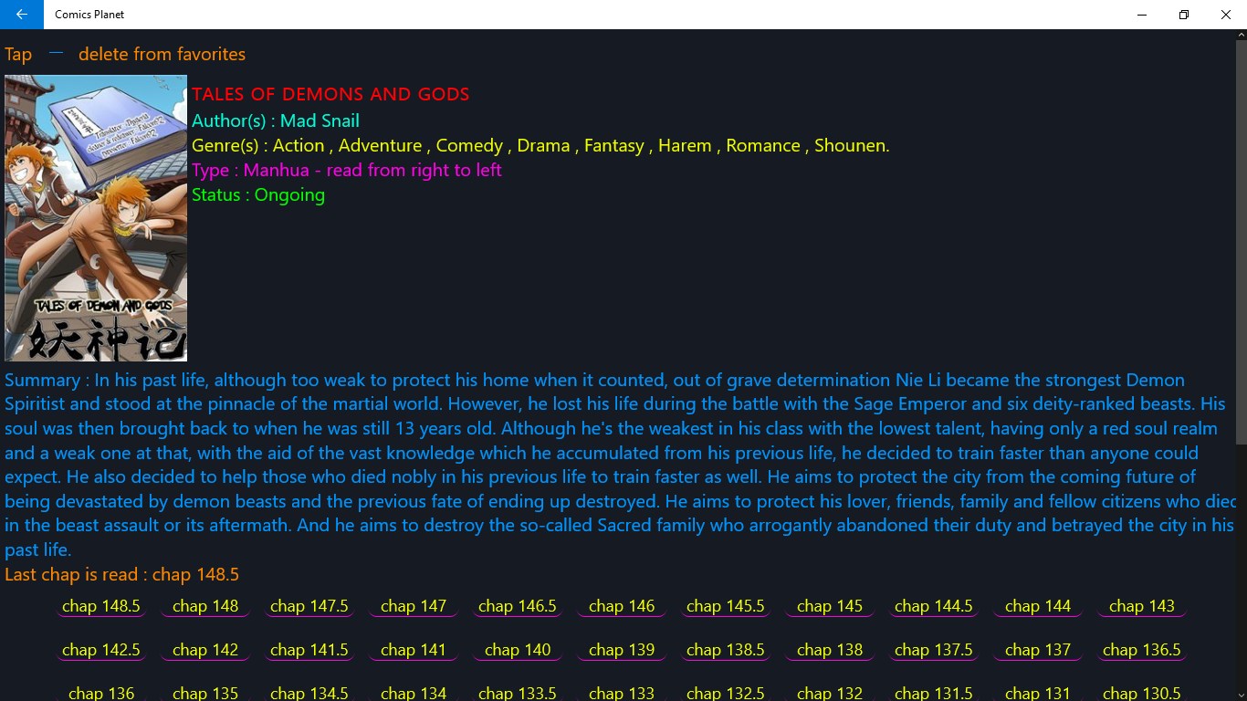 Language : English , Vietnamese ( more in future ) .Add comics to favorites list .Search comics with name , status , genre and type .Bookmark last chapter is read .Support zoom in and out comics pages .Update comics every day .