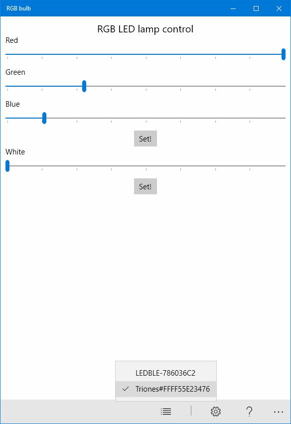 This (very) simple and crude app allows you to control LEDBLE/Triones bulbs, i.e. LED bulb controlled via Bluetooth.
