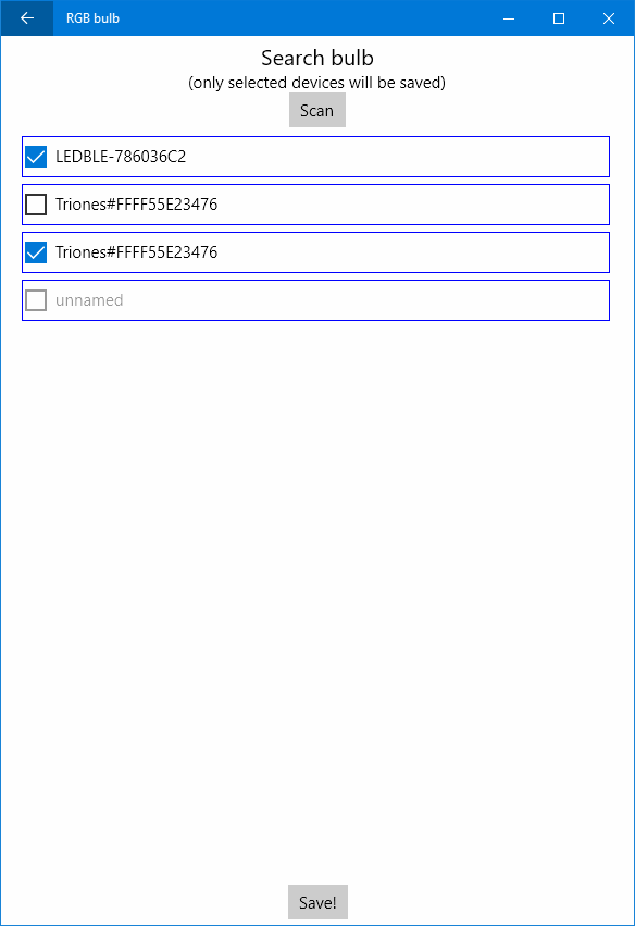 You should scan bluetooth devices, save list of your bulbs, than - from mainpage, select device (or devices) to control, and send command (so, you can send same command to many devices).