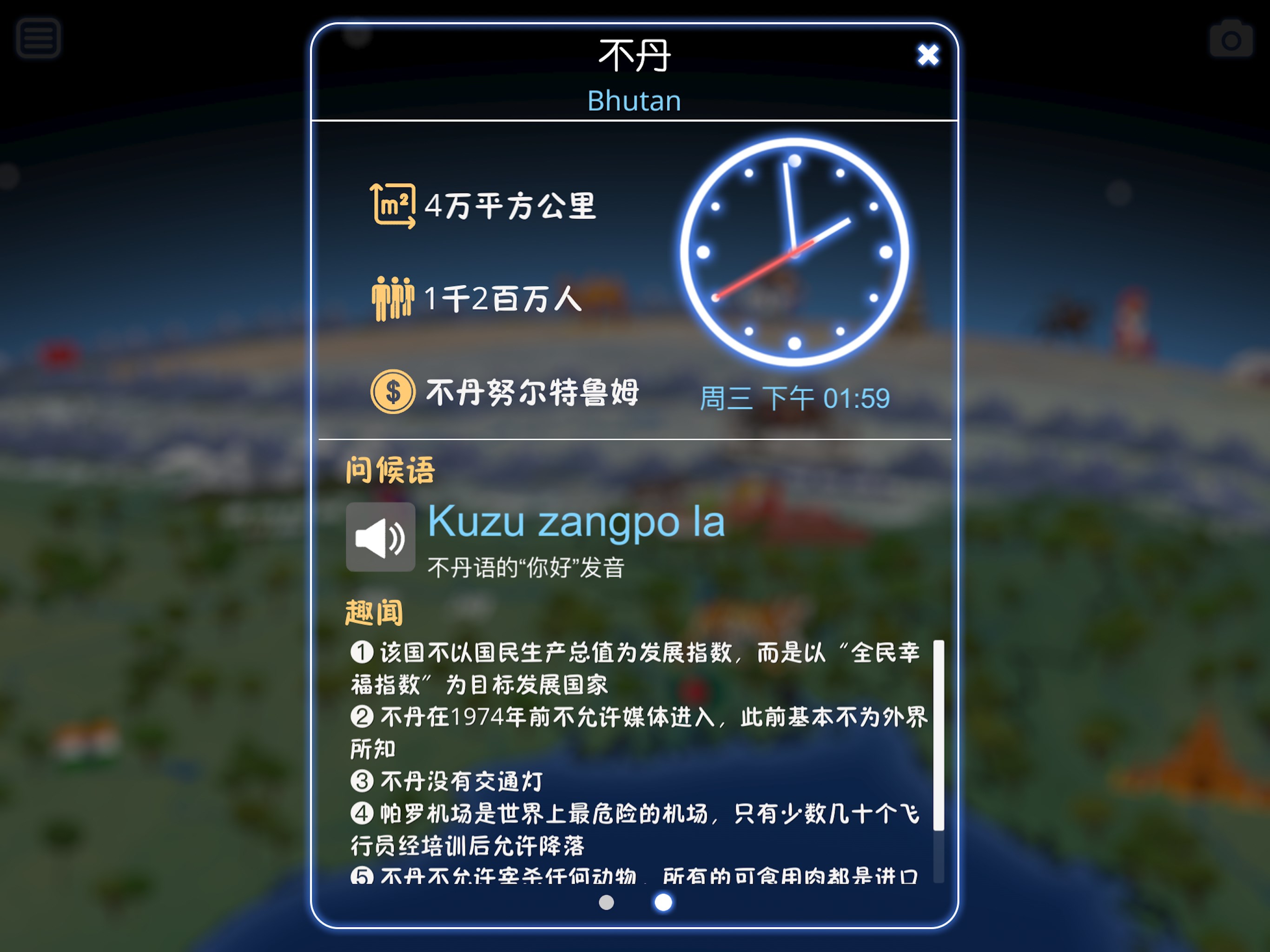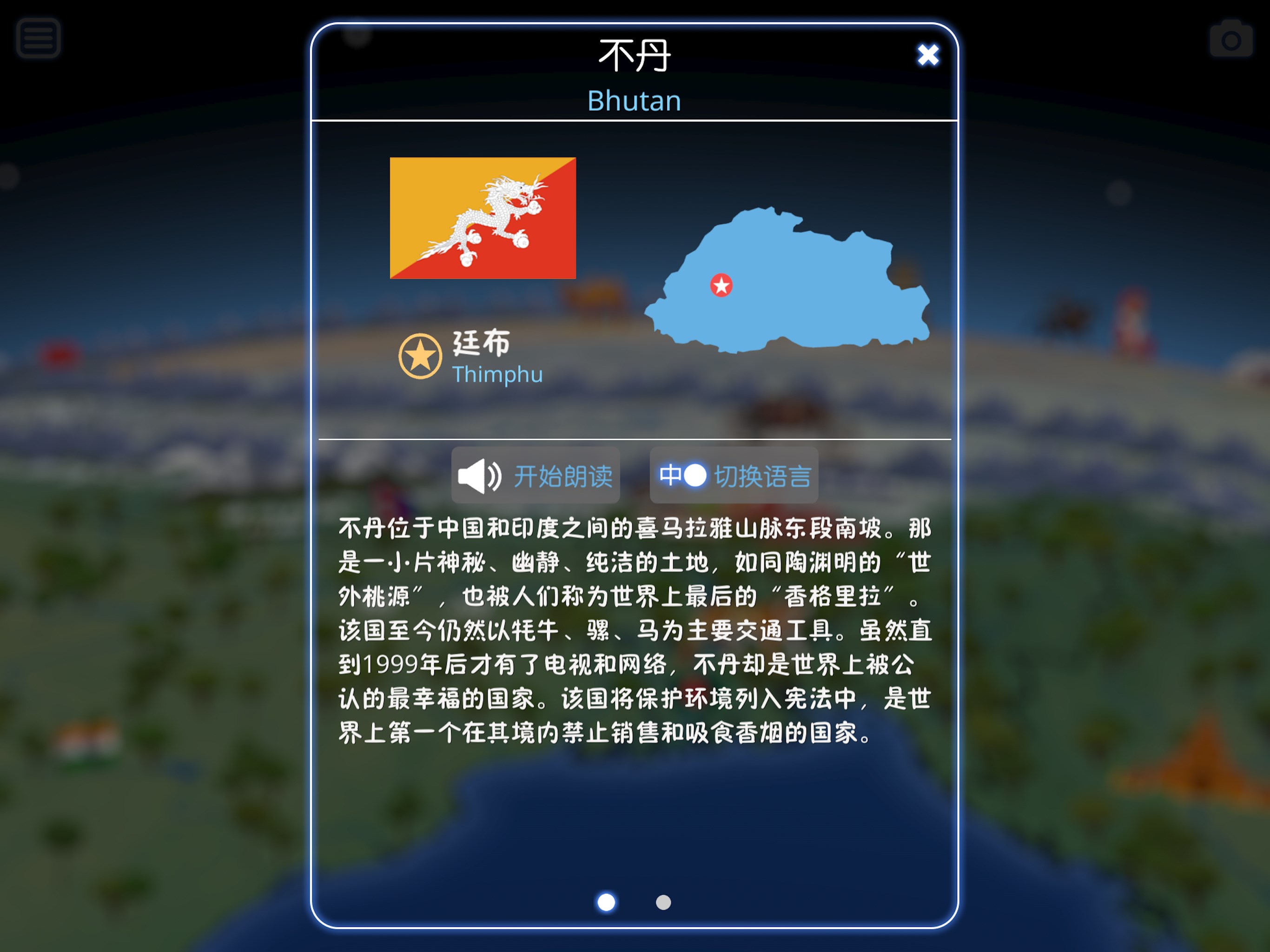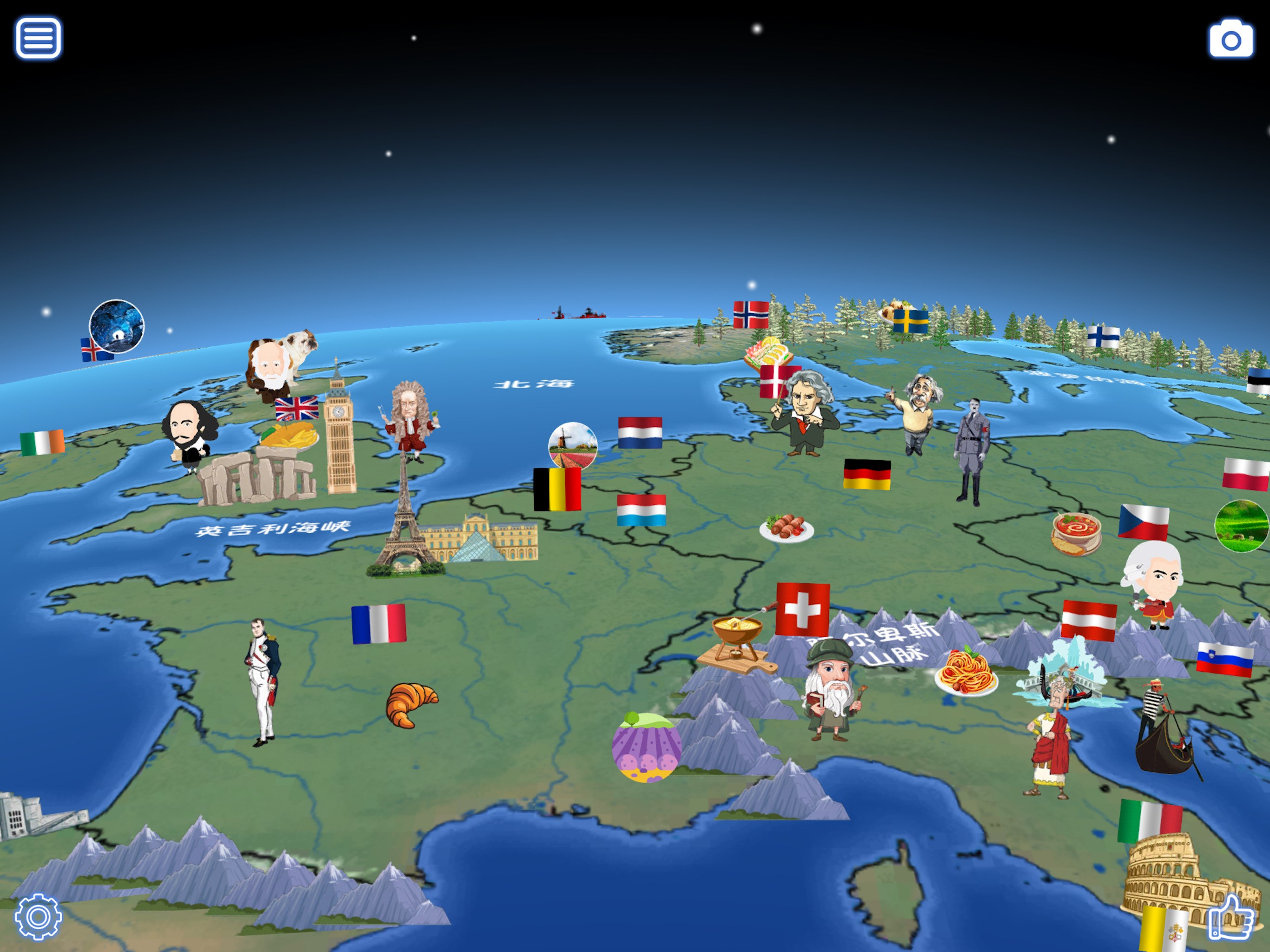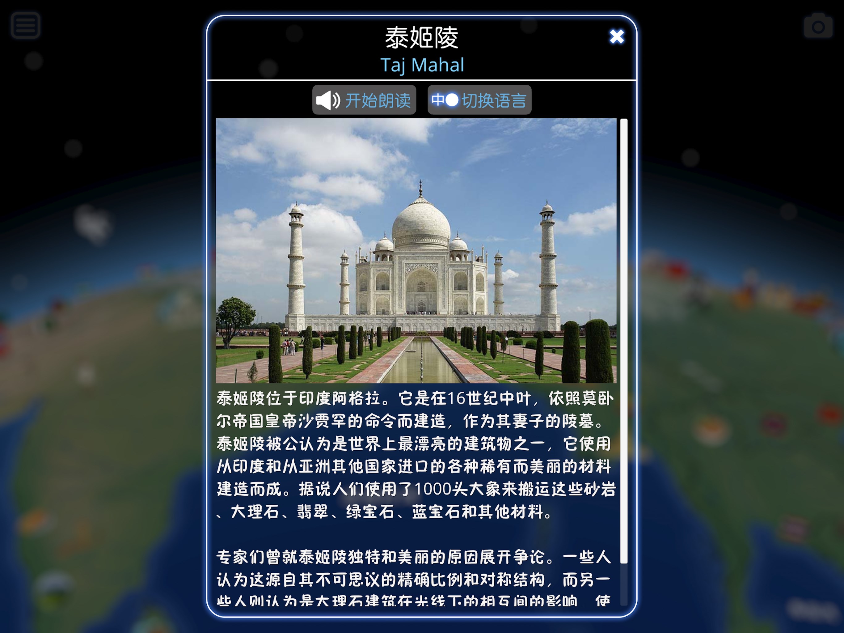 科普百科应用互动地球仪,游戏引擎制作。性能优越。170多个国家的趣味知识世界各地的美食文化按地域分布的野生动物古代和现代有特色的交通工具历史上最具影响力的人物世界史上的建筑奇迹世界上最著名的自然景观旋转和缩放三维地球仪所有内容提供中英对照特色人工智能女声朗读显示和隐藏地球上的国旗,图标调节背景音乐和朗读音量