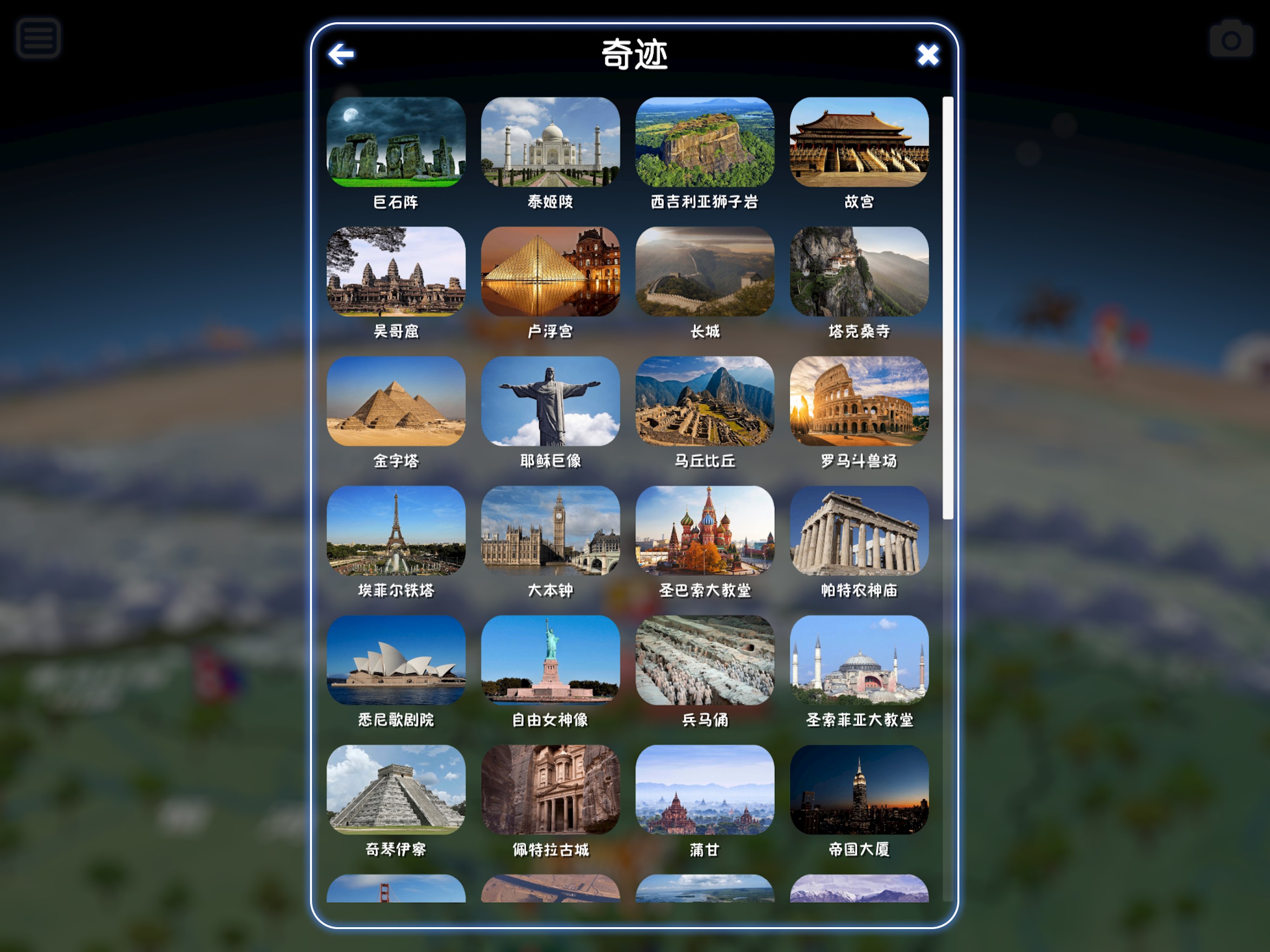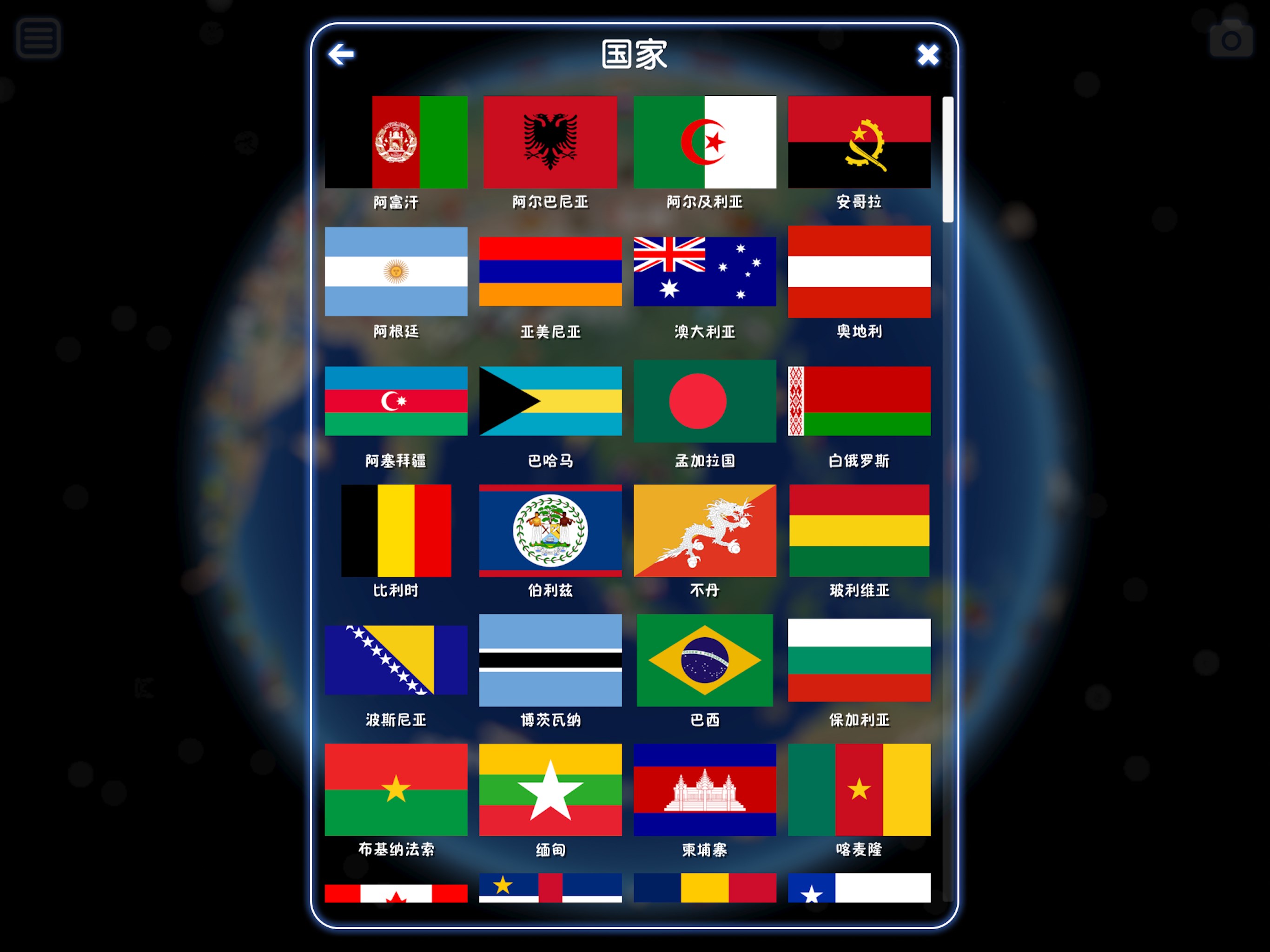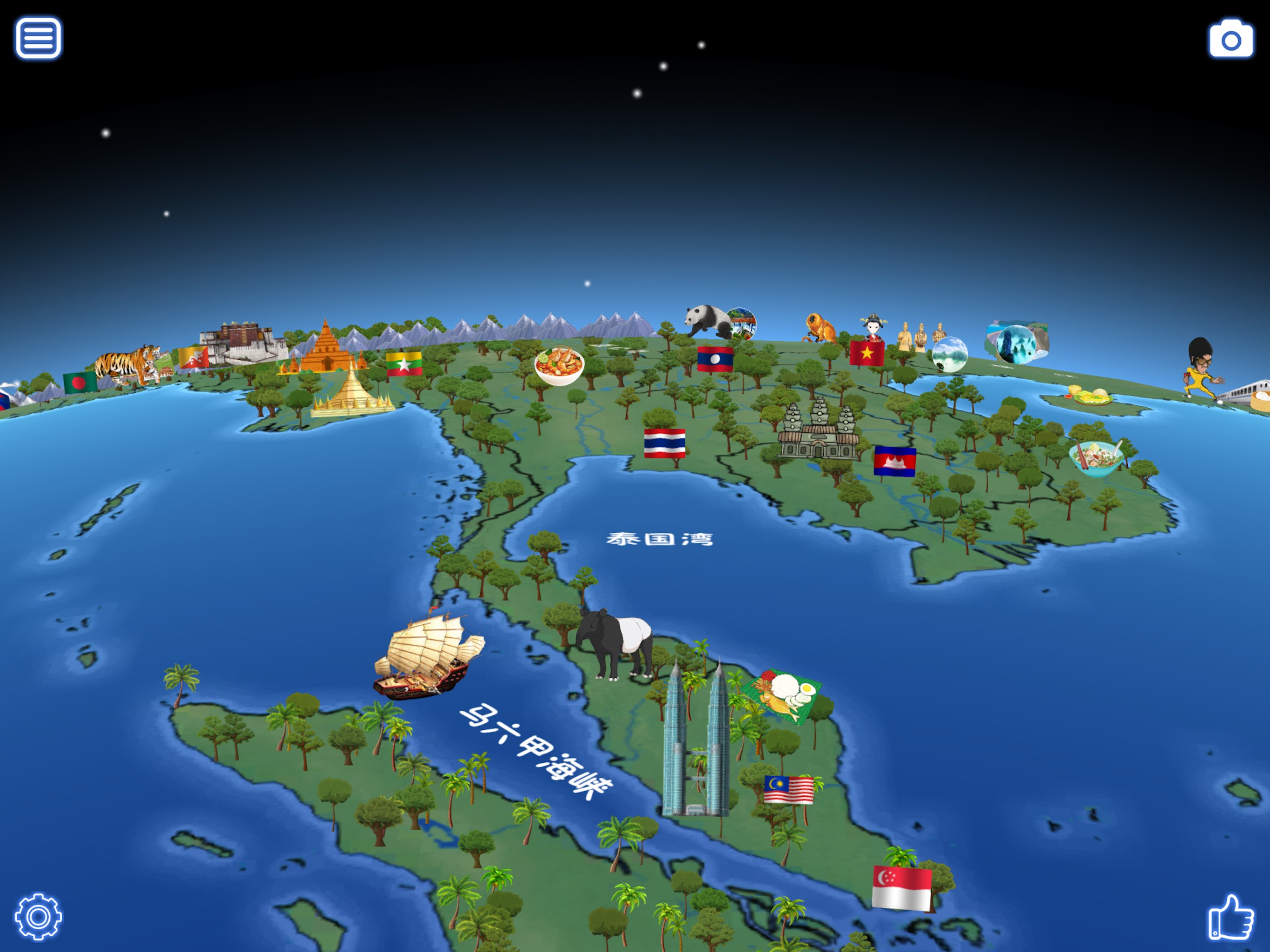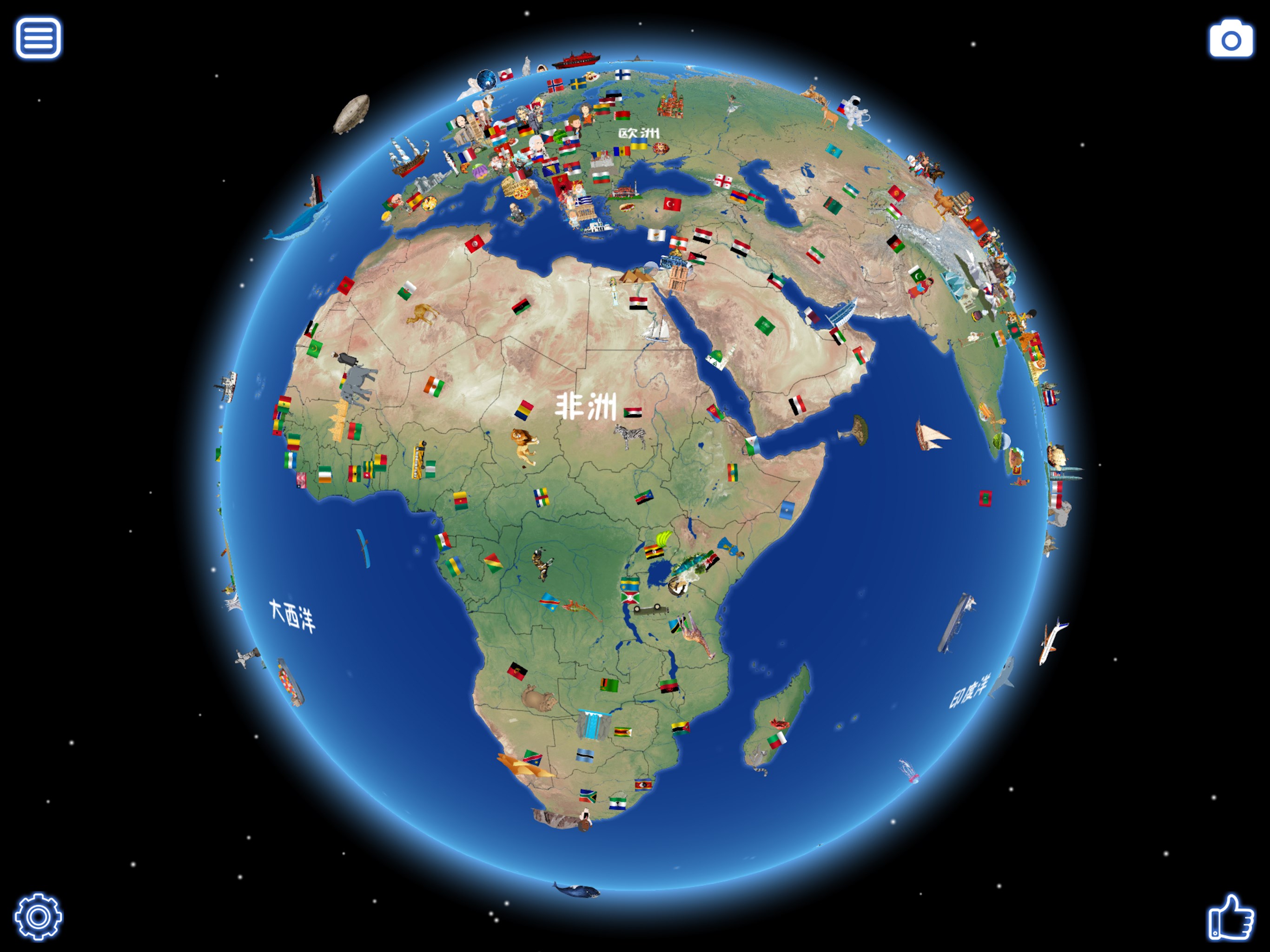 科普百科应用互动地球仪,游戏引擎制作。性能优越。170多个国家的趣味知识世界各地的美食文化按地域分布的野生动物古代和现代有特色的交通工具历史上最具影响力的人物世界史上的建筑奇迹世界上最著名的自然景观旋转和缩放三维地球仪所有内容提供中英对照特色人工智能女声朗读显示和隐藏地球上的国旗,图标调节背景音乐和朗读音量