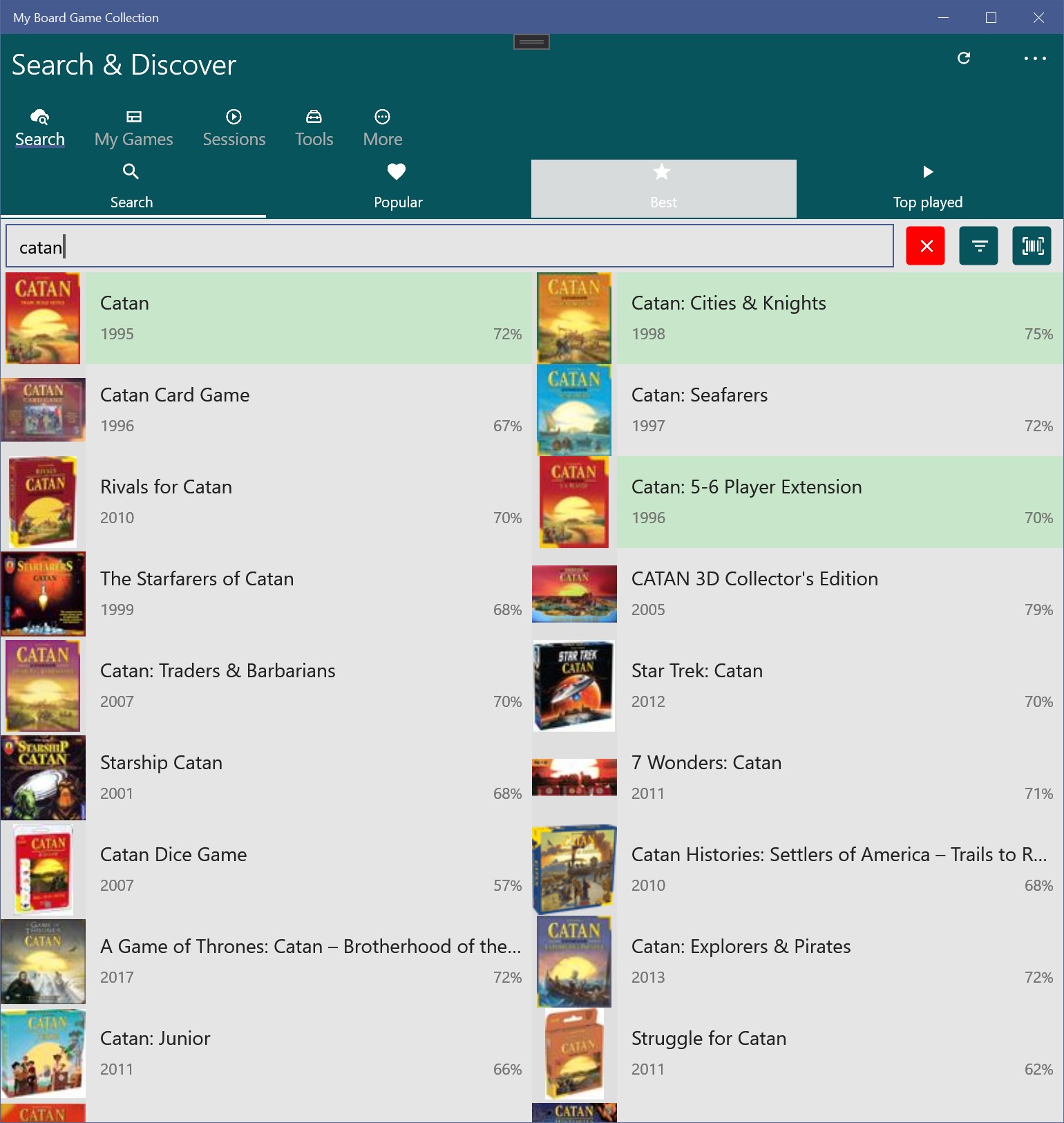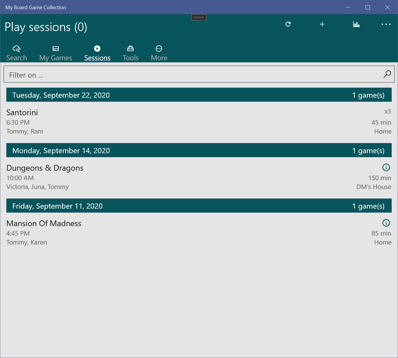 Log your play sessions and keep track of what, when and where you played. You can also log who played and who won and with what score. Never forget.