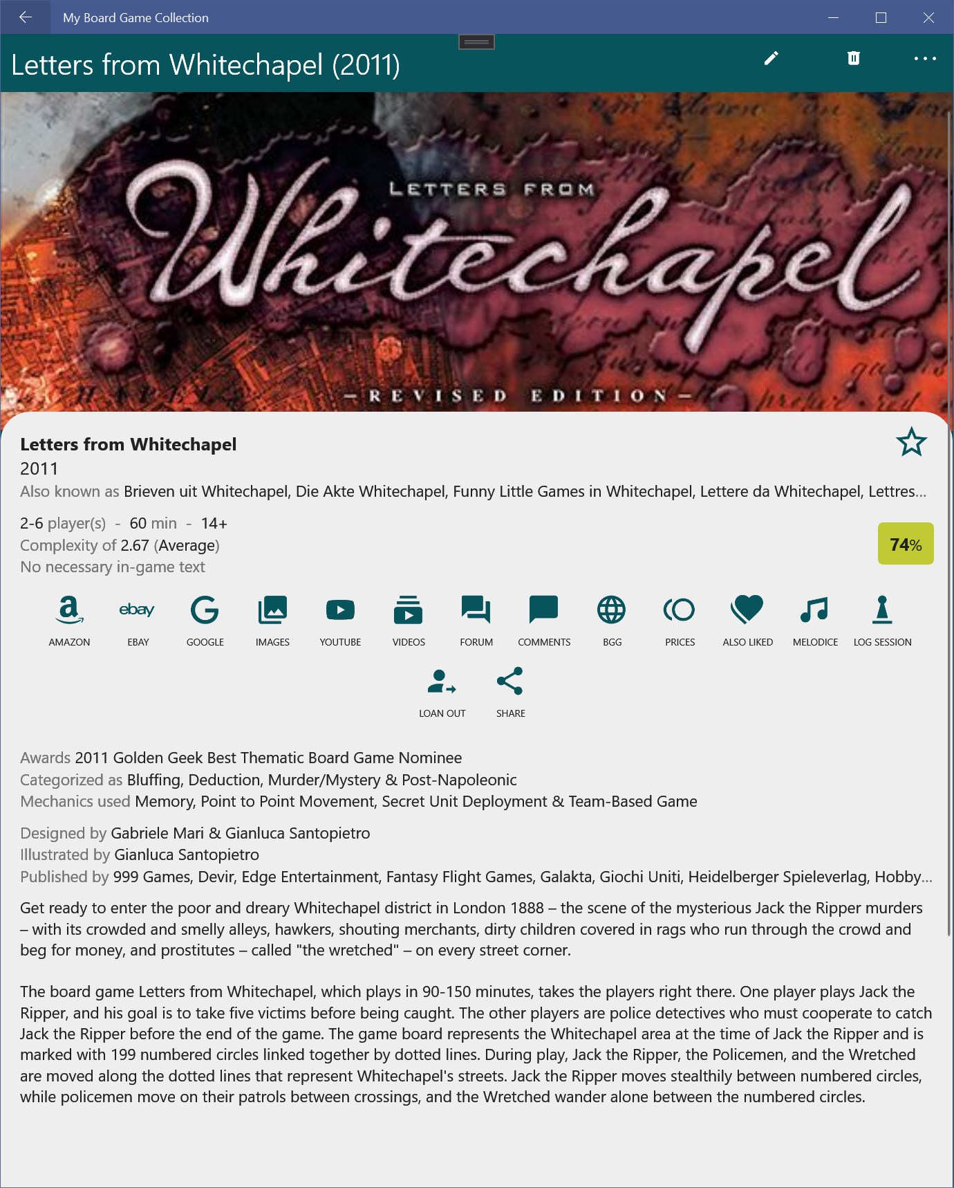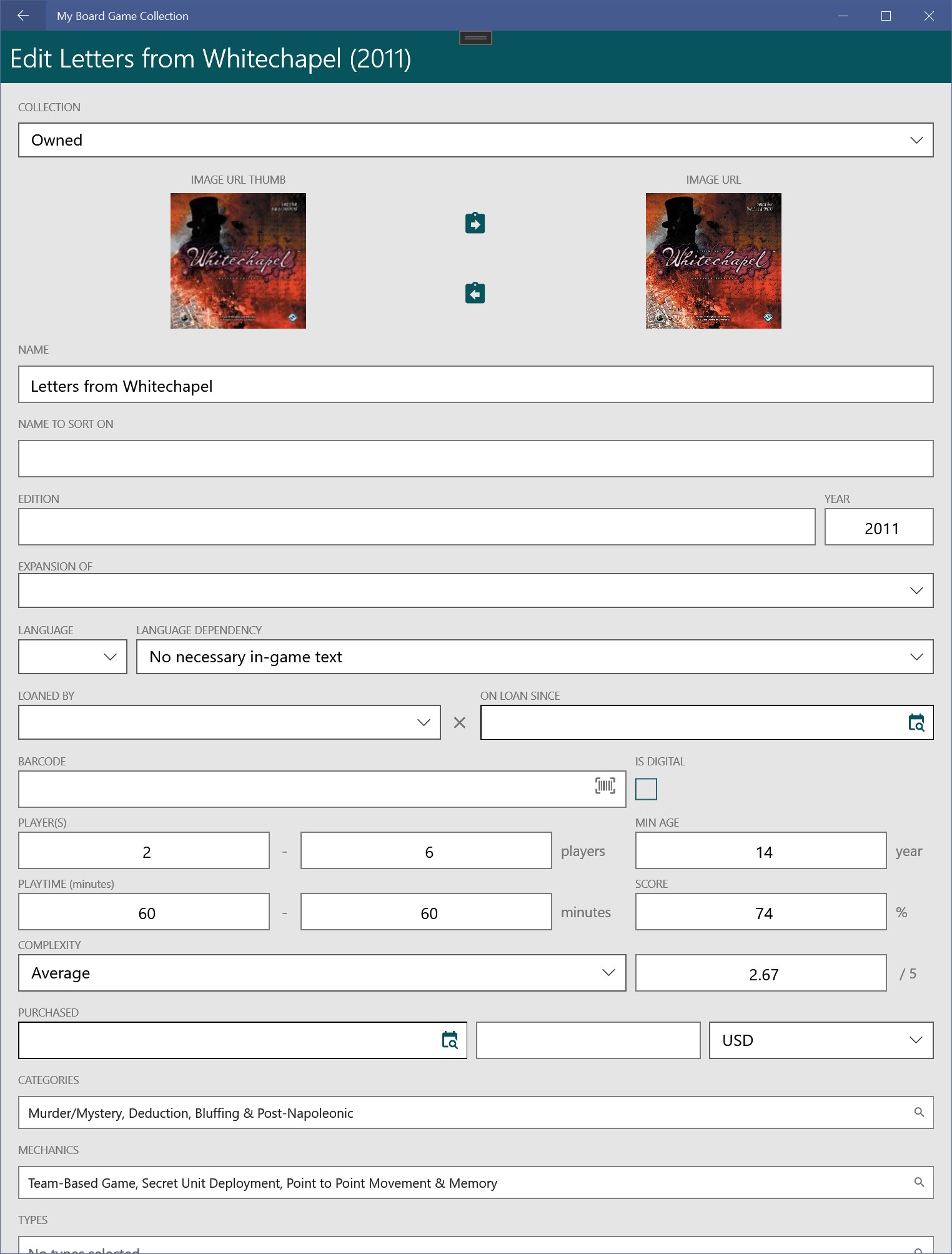 You can add videos (f.e.: how to play), website urls (f.e.: alternate play rules), images (f.e.: your pictures), your notes, game language, tags, purchase date & purchase price and more.