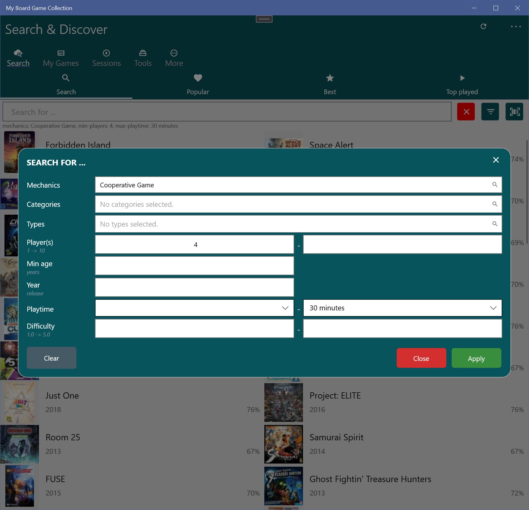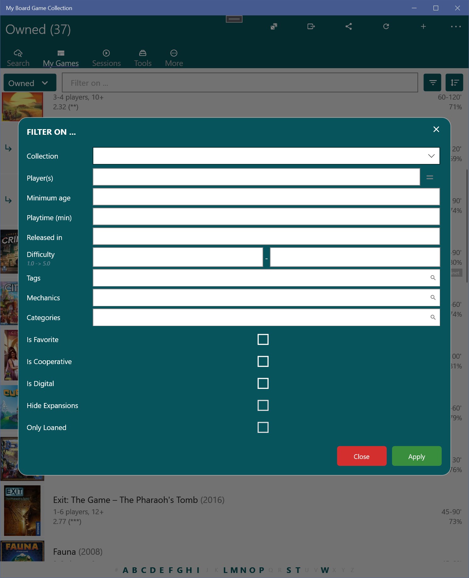 Choosing a boardgame to play is not always easy, that is why we give you multiple options to filter your collection: name, cooperative play, number of players, playtime, release year, is digital, difficulty, tags or/and a favorite.