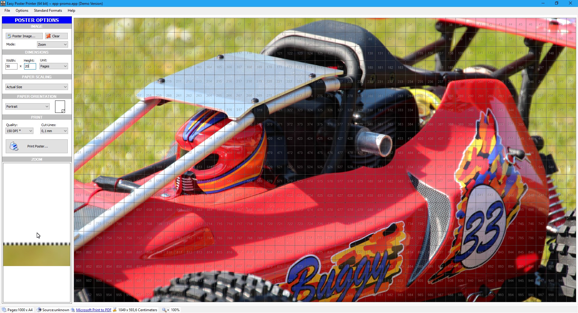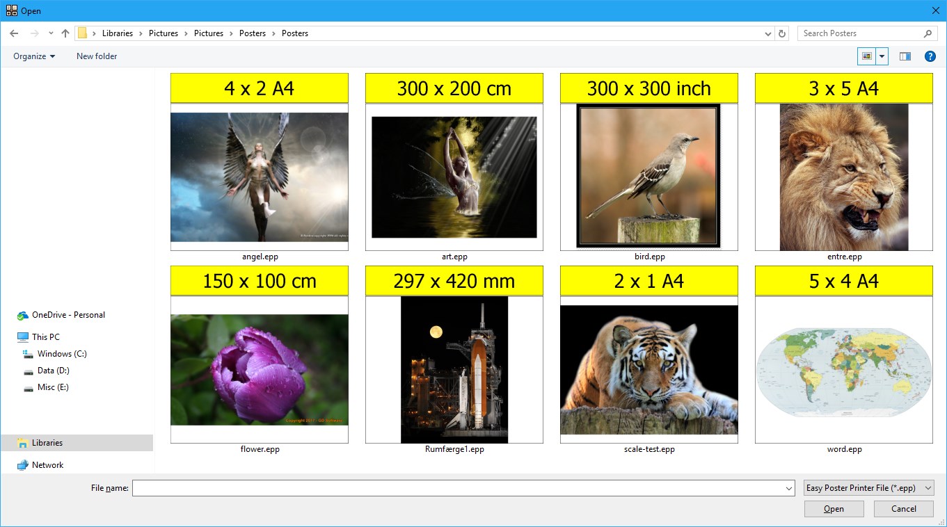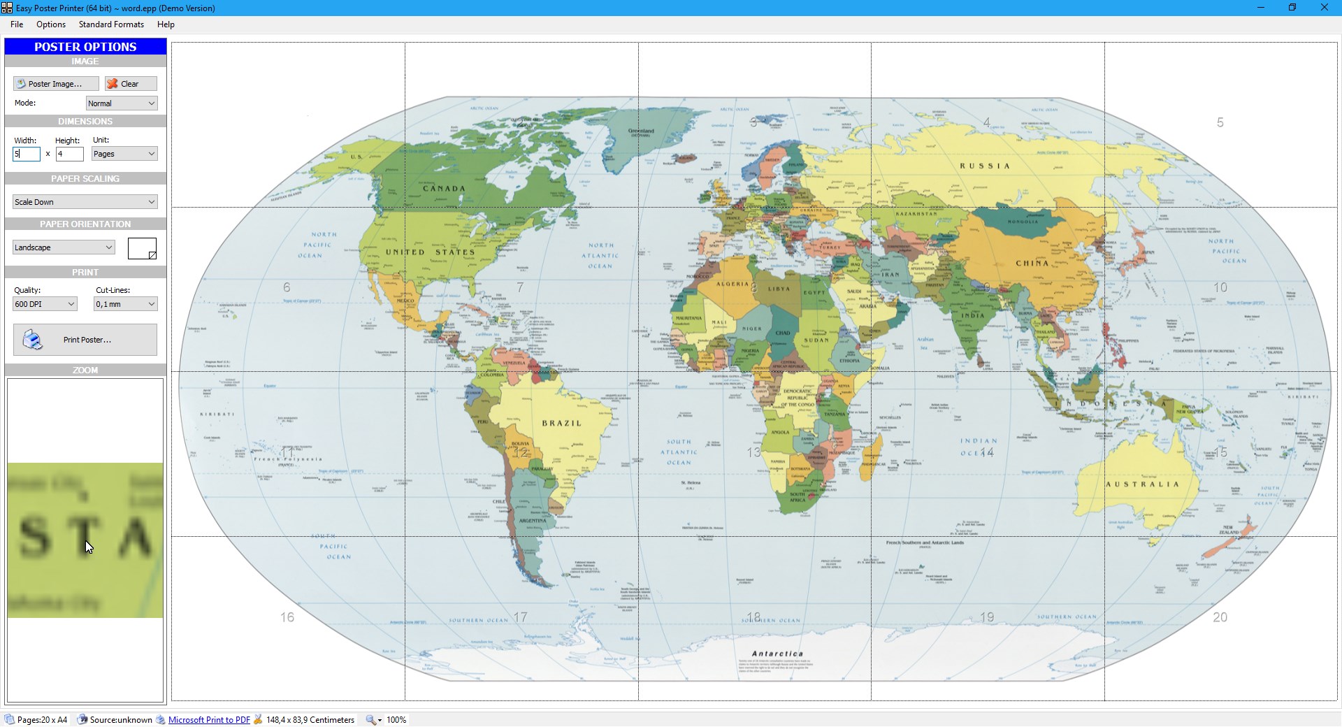 Easy Poster Printer is an easy to use application for creating posters (in any size up to 20 x 20 meters) using a regular printer.