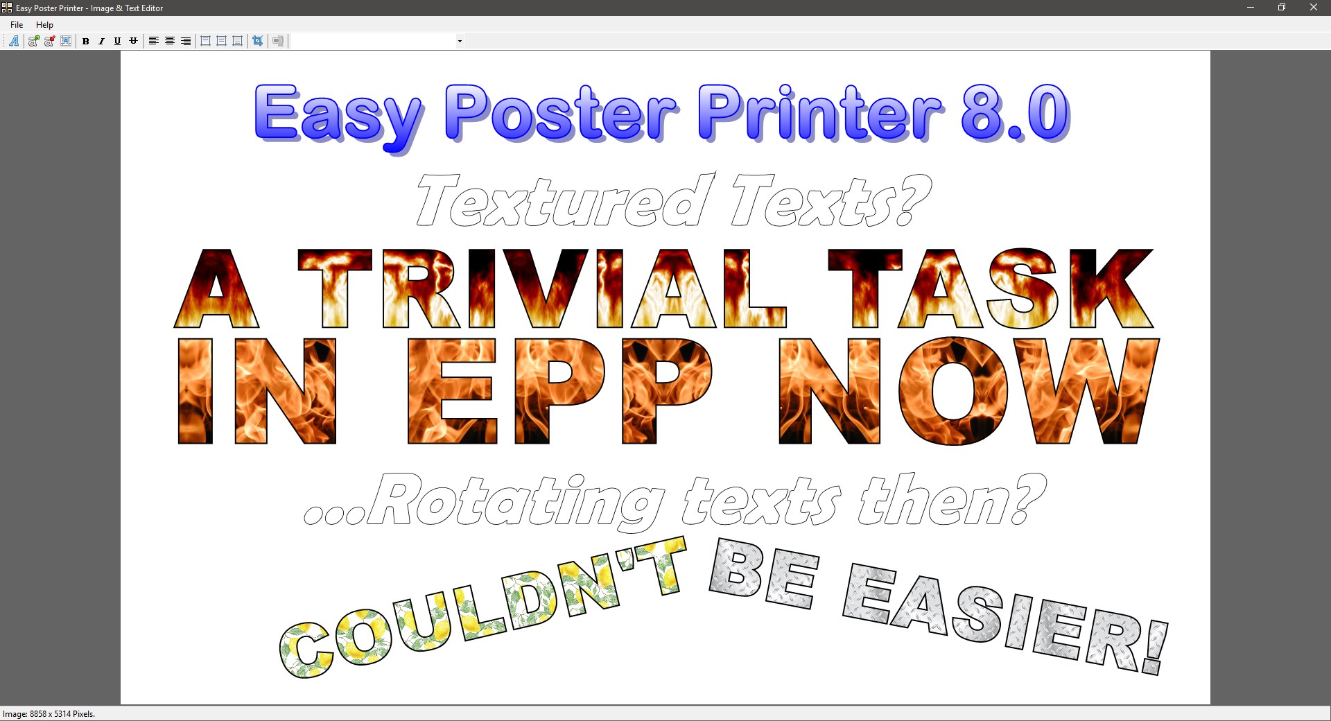 With Easy Poster Printer its easy to insert a photo and write custom text, decide the size of the poster, paper format (for the printer) and even export the poster images and use your favorite print software.