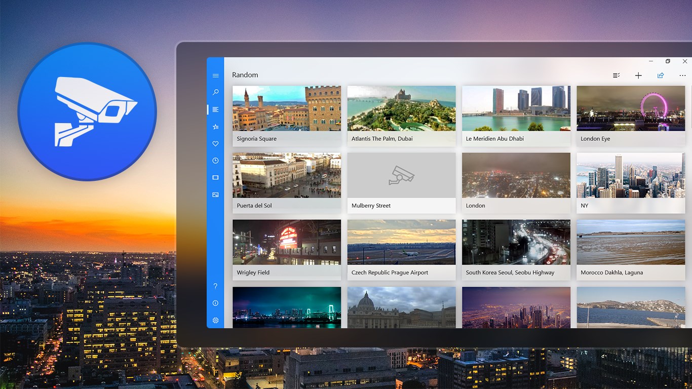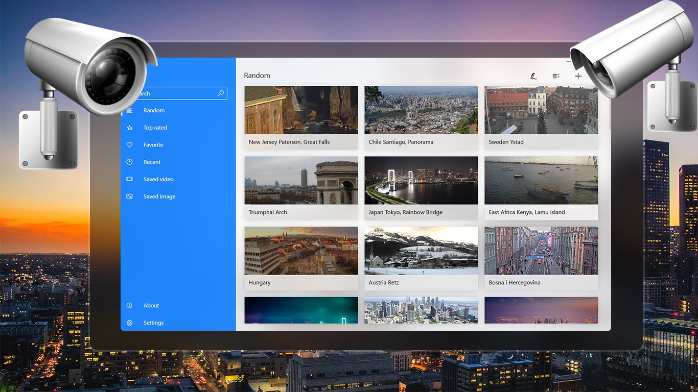Amount of real-time webcams, live cams, public IP cameras.Top live streamings in high-resolution.Random mode for watching.Convenient search for cameras.List of recently viewed cameras.Add the most amazing places to Favorites.Add your own cameras to the application.Pin favorite cameras to the Start screen.Likes/ Dislikes for cameras.Select all cameras, delete needed ones.Rename cameras in the application.Take screenshots while watching.Draw with Windows Ink tool.Share screenshots with friends.Support for Cortana voice commands.Support for Windows Hello.