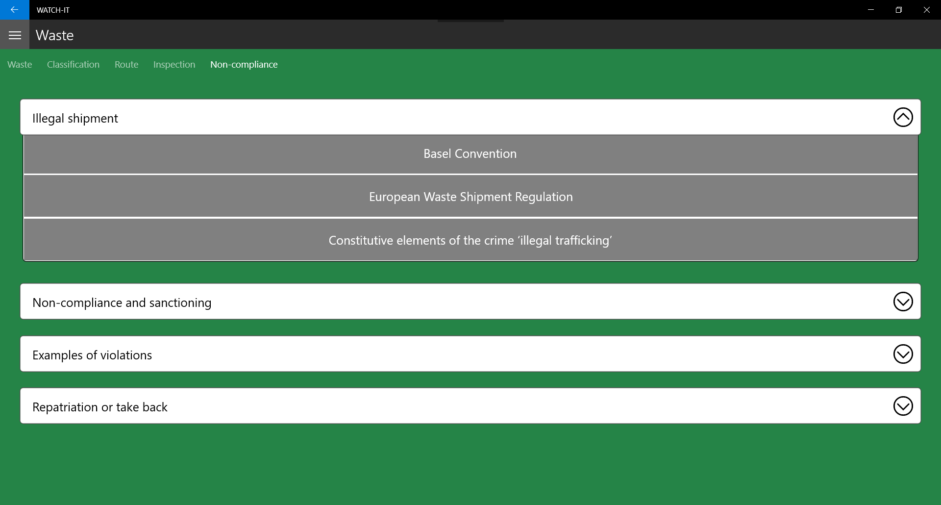 Legislation can be complex and lengthy. This app zooms in on the legal provisions relevant for shipments of waste and chemicals during a first assessment by inspectors and law enforcement officers.