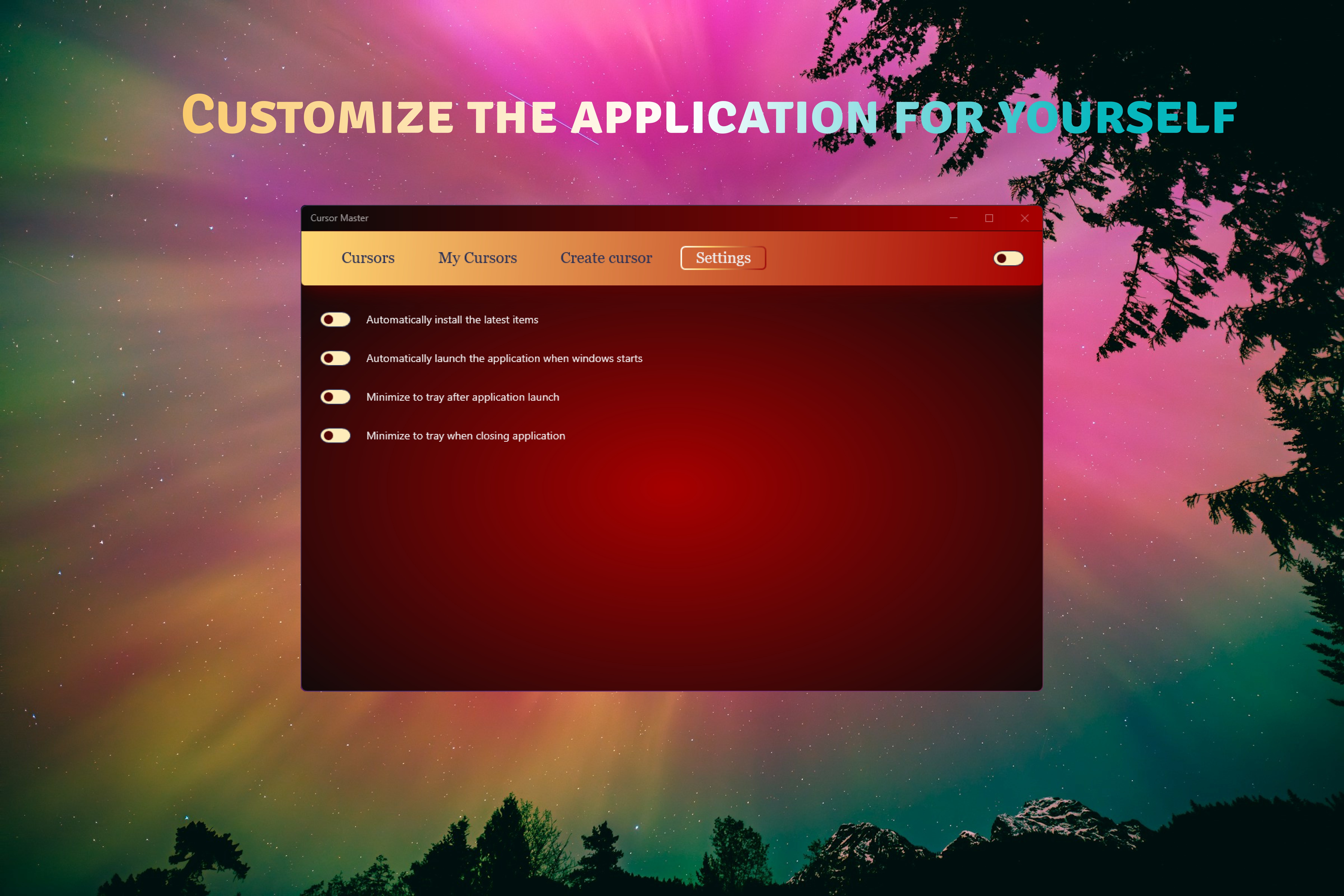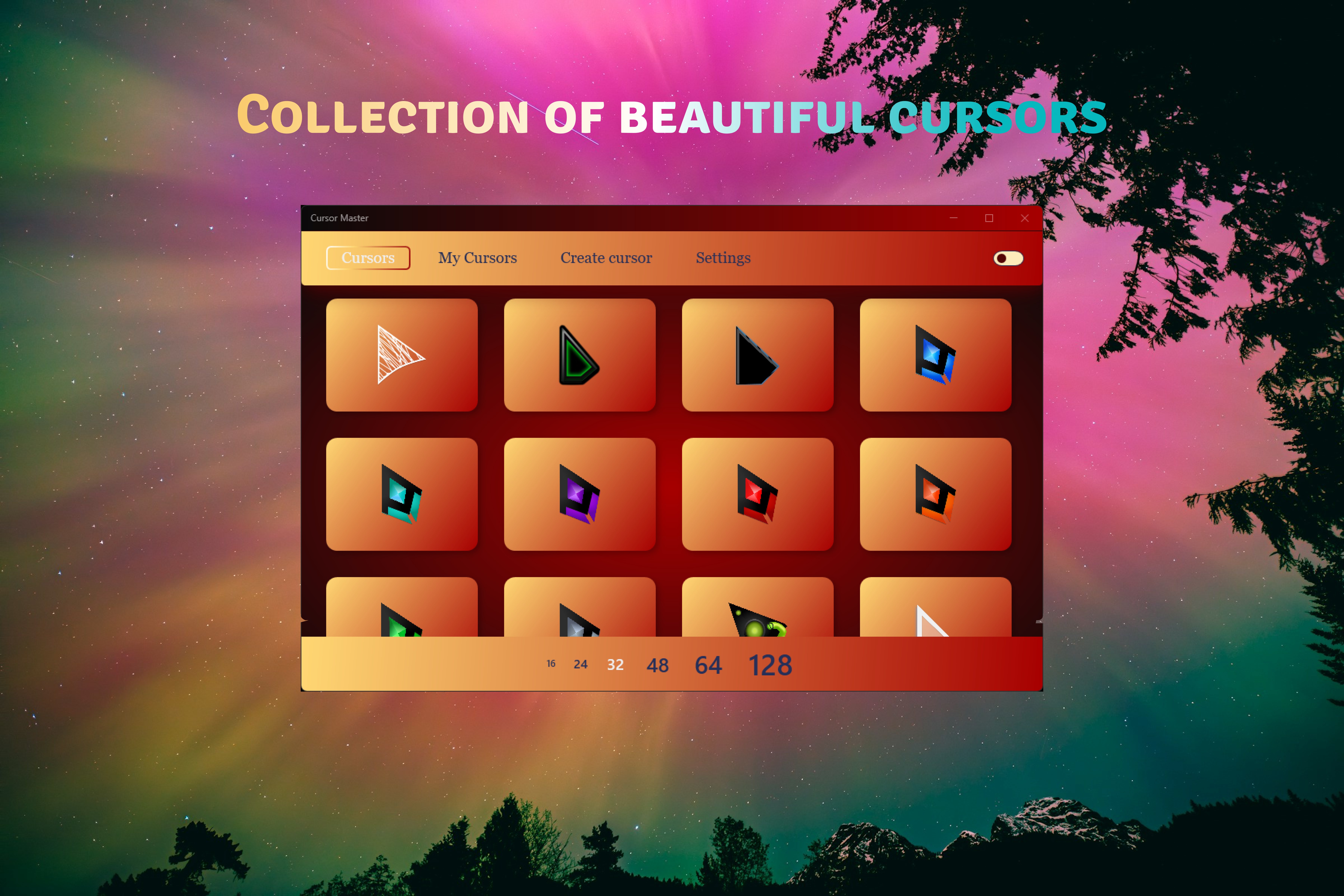 Installing beautiful cursors in your Windows systemConstantly growing list of cursorsCreating your own cursors from imagesCursor size changesCustomizing the application to suit your needs
