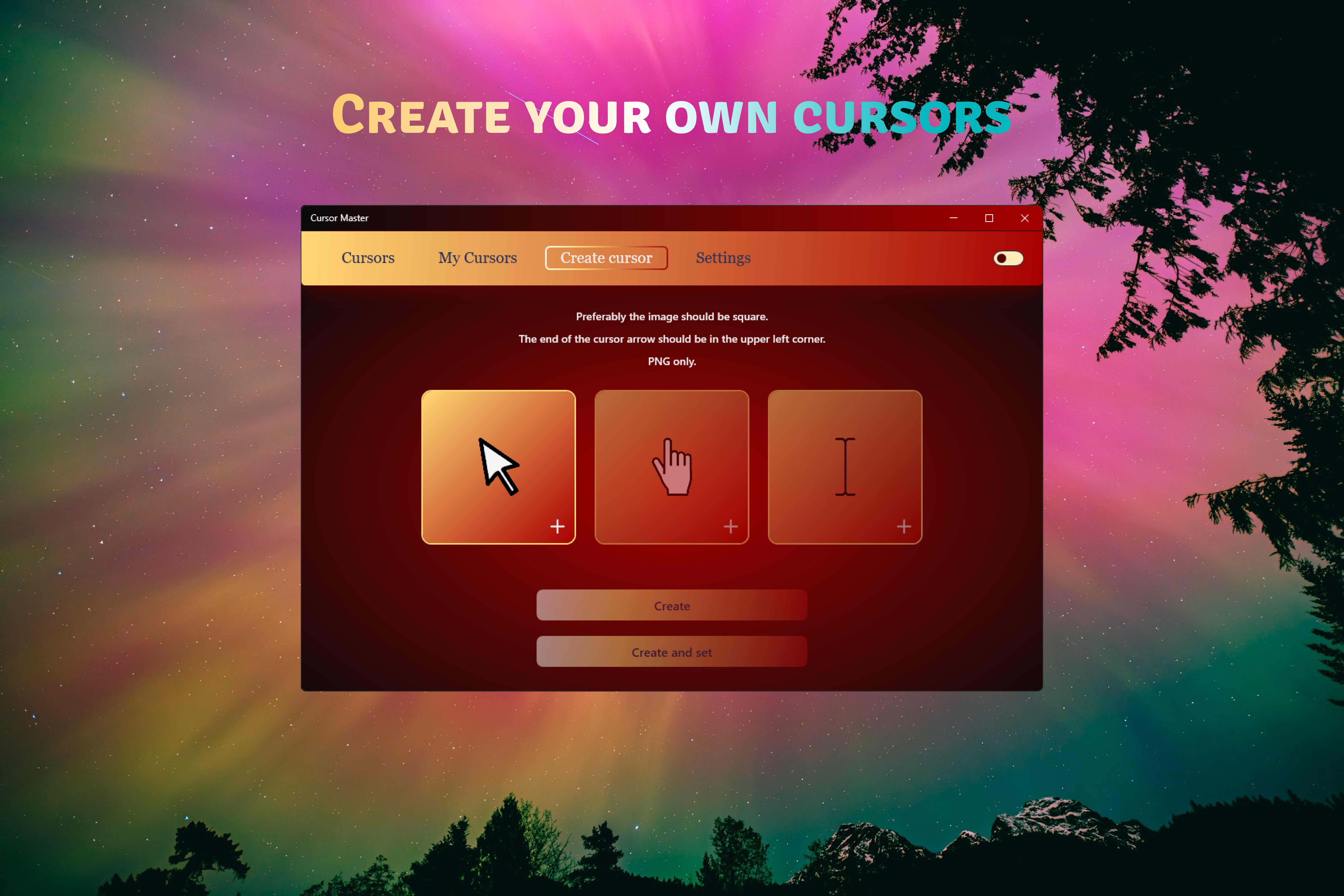 For the most creative users, we offer the ability to create your own cursors. You can upload your images and use them as cursors, adding a personal touch to your desktop.