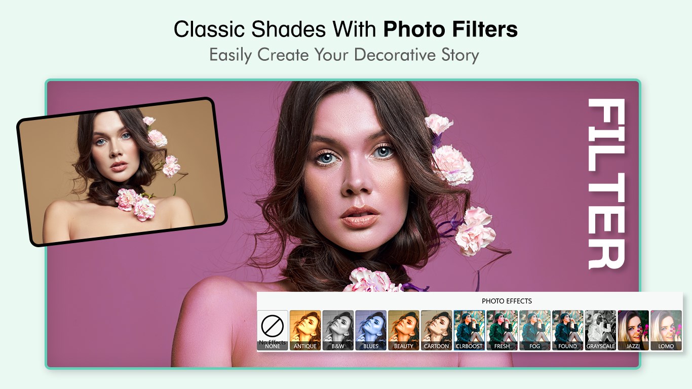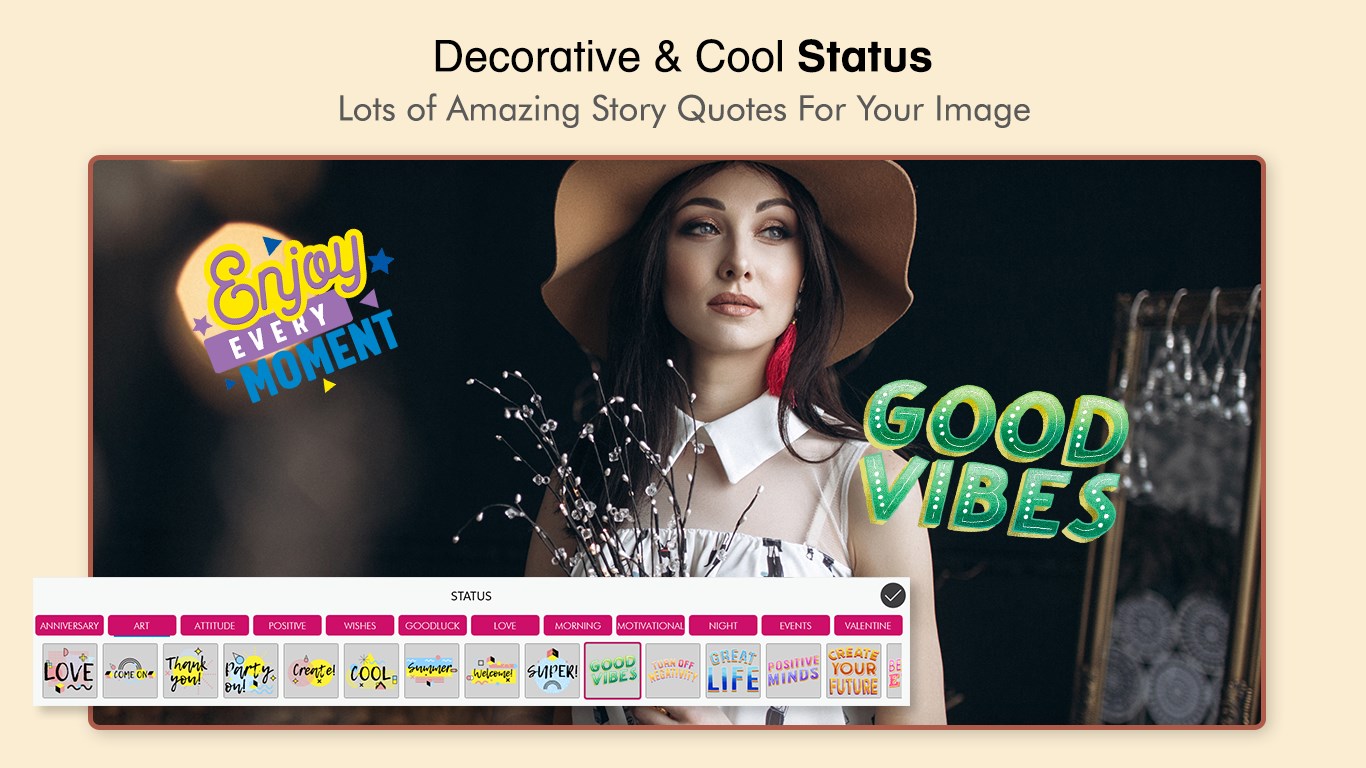 Fascinating Photo Editor Filter Stickers & Beauty Selfie Camera app lets you create the ideal photo with huge number of fun stickers, emojis, cool faces, cat faces, customized text, square size movable image with blurred image background.