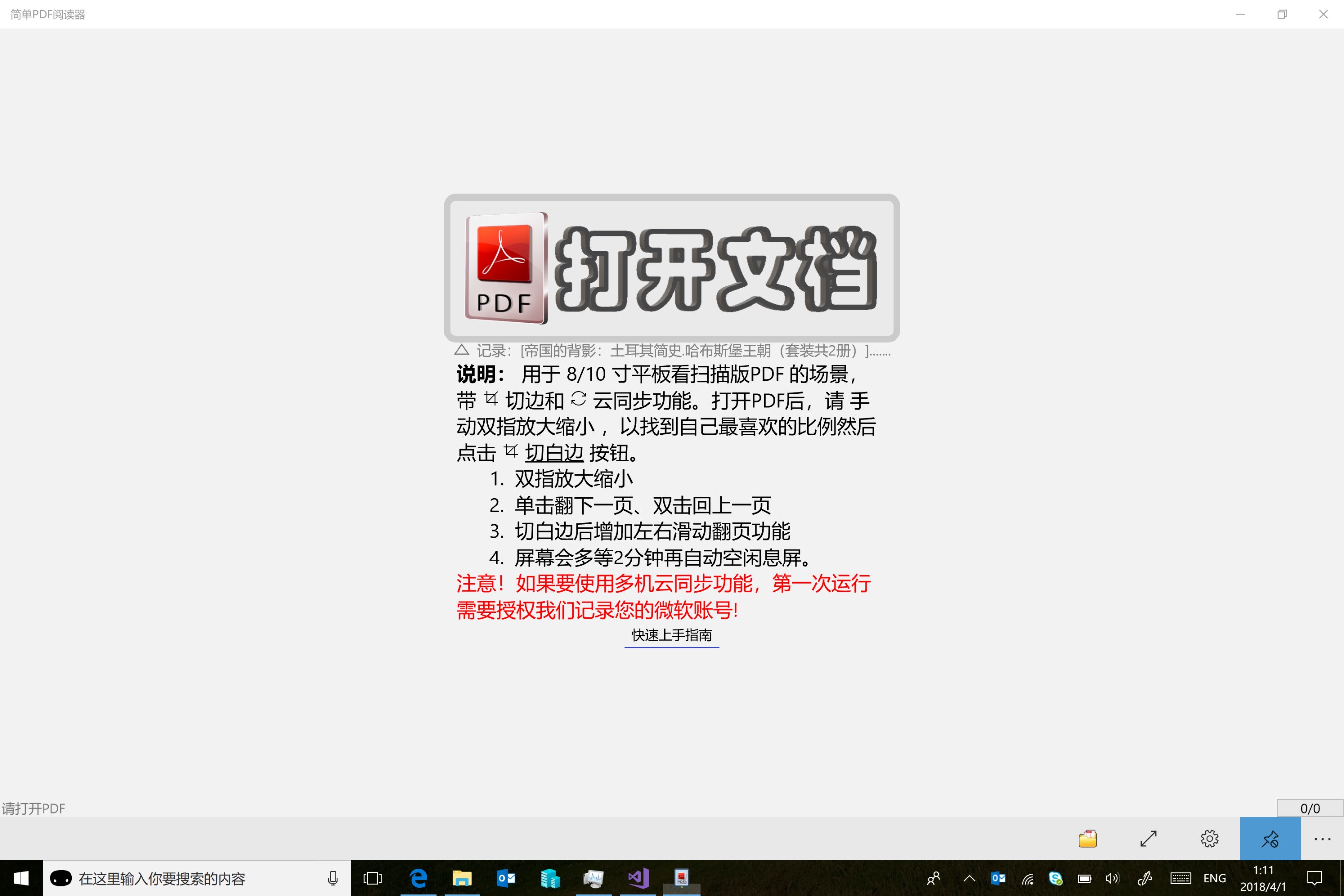 喜欢阅读的朋友,往往都会有一些收集到的“扫描版”PDF文件。这类文件在各种手机上的阅读体验都很糟糕,最佳的阅读体验应该在8~13寸平板电脑上。虽然这类型的Windows平板不在少数,可惜的是,我没有找到顺手的App。于是自己做了一个简单的PDF阅读器来实现一下功能。
