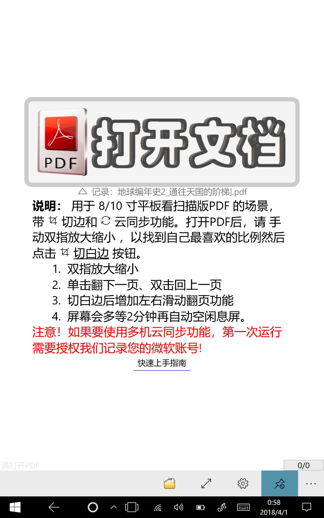 - 多设备云服务同步:如果您允许本App读取您的微软账号,则可以选择把文档的阅读进度保存到微软Azure云服务。在其他机器上打同名PDF,点击一下同步即可回到最远的位置。类似kindle(由于是我注册的免费微软云服务,所以只能给每个账号保留最后五个文档的进度)。