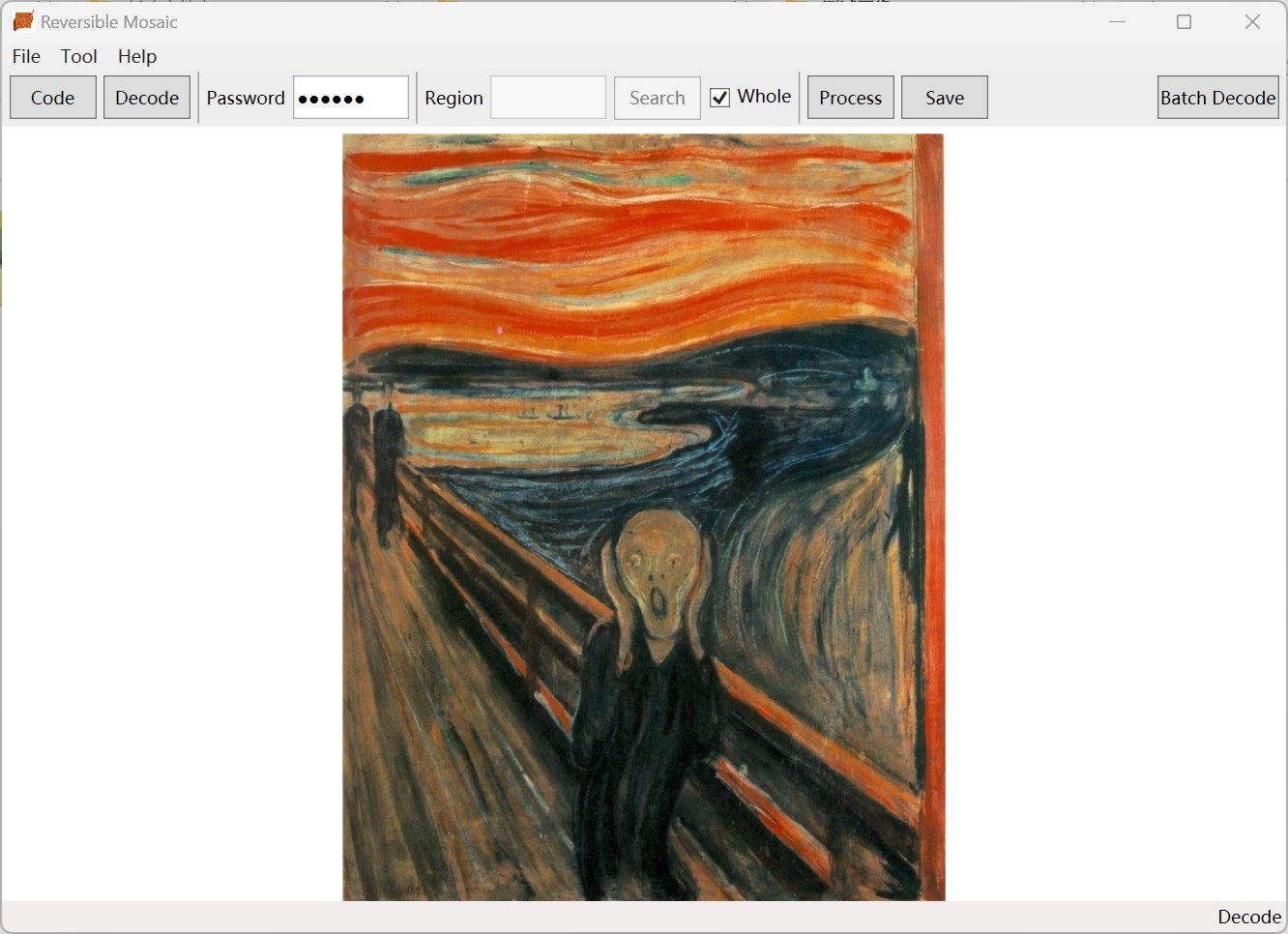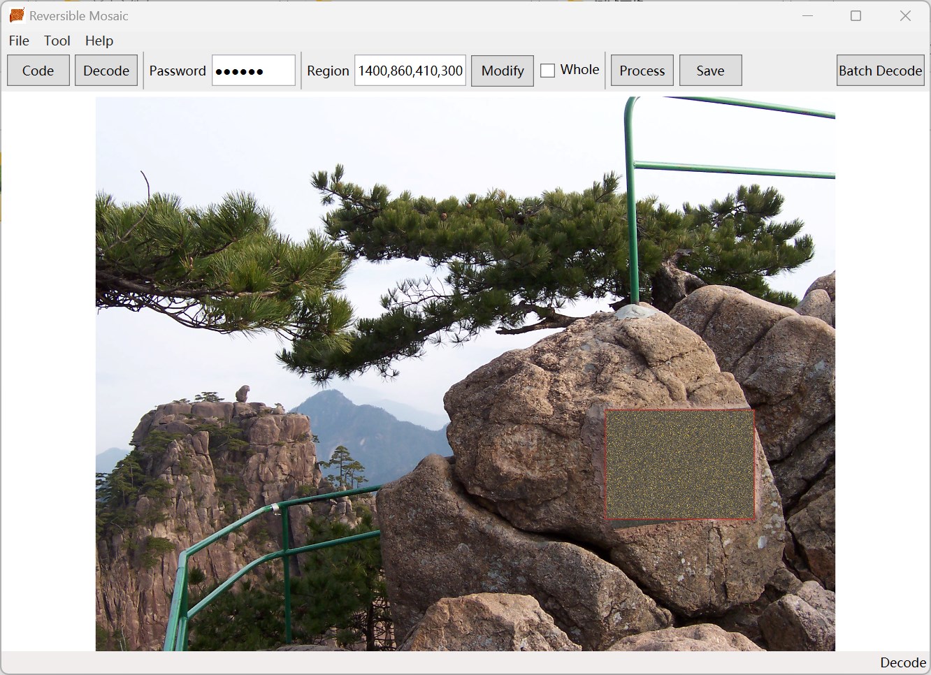 After using this software to code the photo, you only need to provide the correct password to decode the area with mosaic.