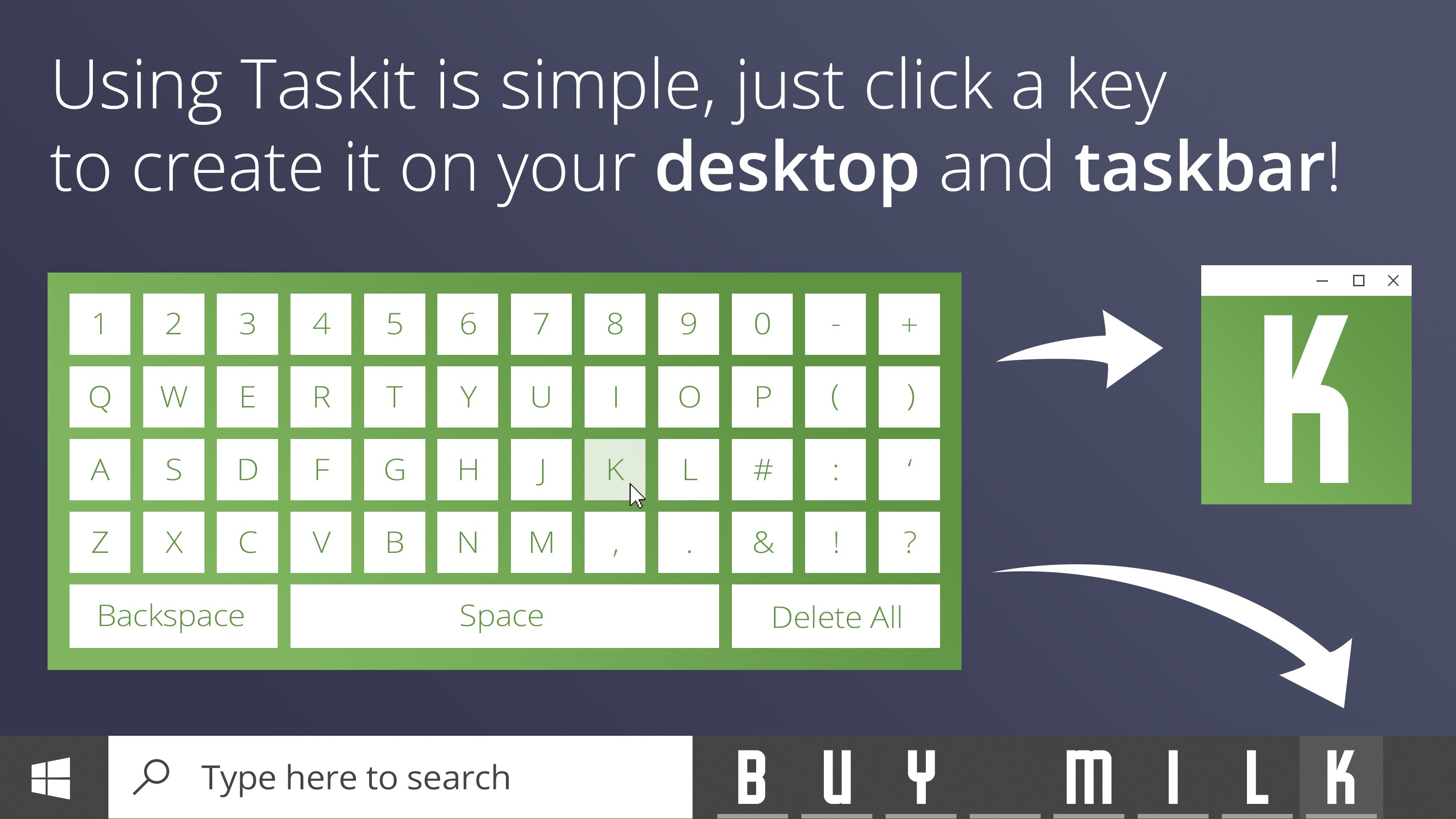 The taskbar, such an underappreciated aspect of our desktop. We use it to manage our apps, games and documents countless times every day, but who manages the manager? Taskit, that's who! Introducing the first productivity app that allows you to type on your taskbar, helping you stay organised, keep tabs, or win your next game of Scrabble. You can also link these icons to your favourite documents, folders and websites, supercharging your workflow!