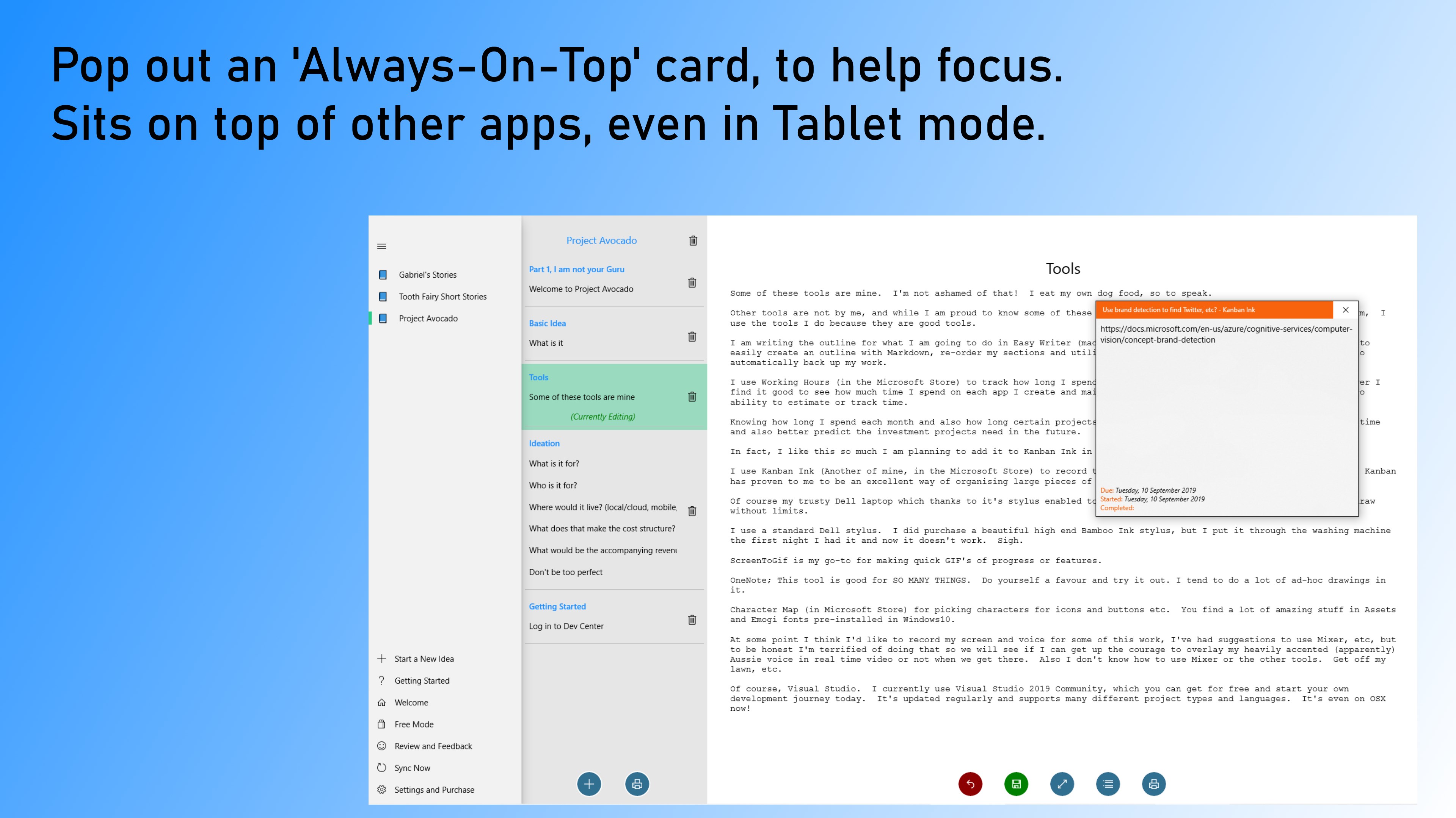 Kanban interfaceTouch and Mouse/Keyboard inputTo do planningInbuilt Windows Ink with Stylus and Finger supportFree versionDrag and DropAlways on Top/Pop Out CardsTo Do, In Progress, Completed, Backlog and Declined CardsOrganise with #Tags.