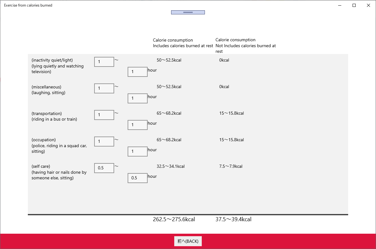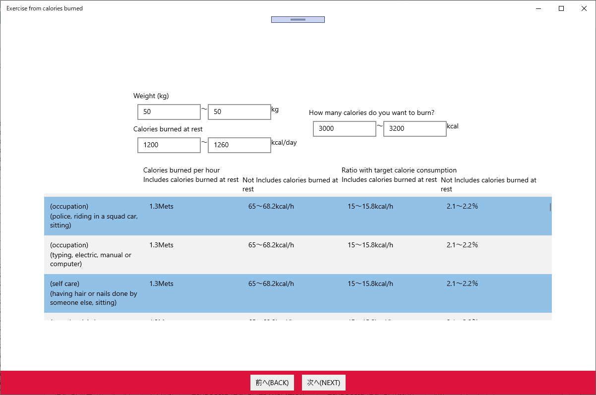 By entering weight and target calorie consumption, exercise whose calorie consumption is close to the target calorie consumption is displayed.