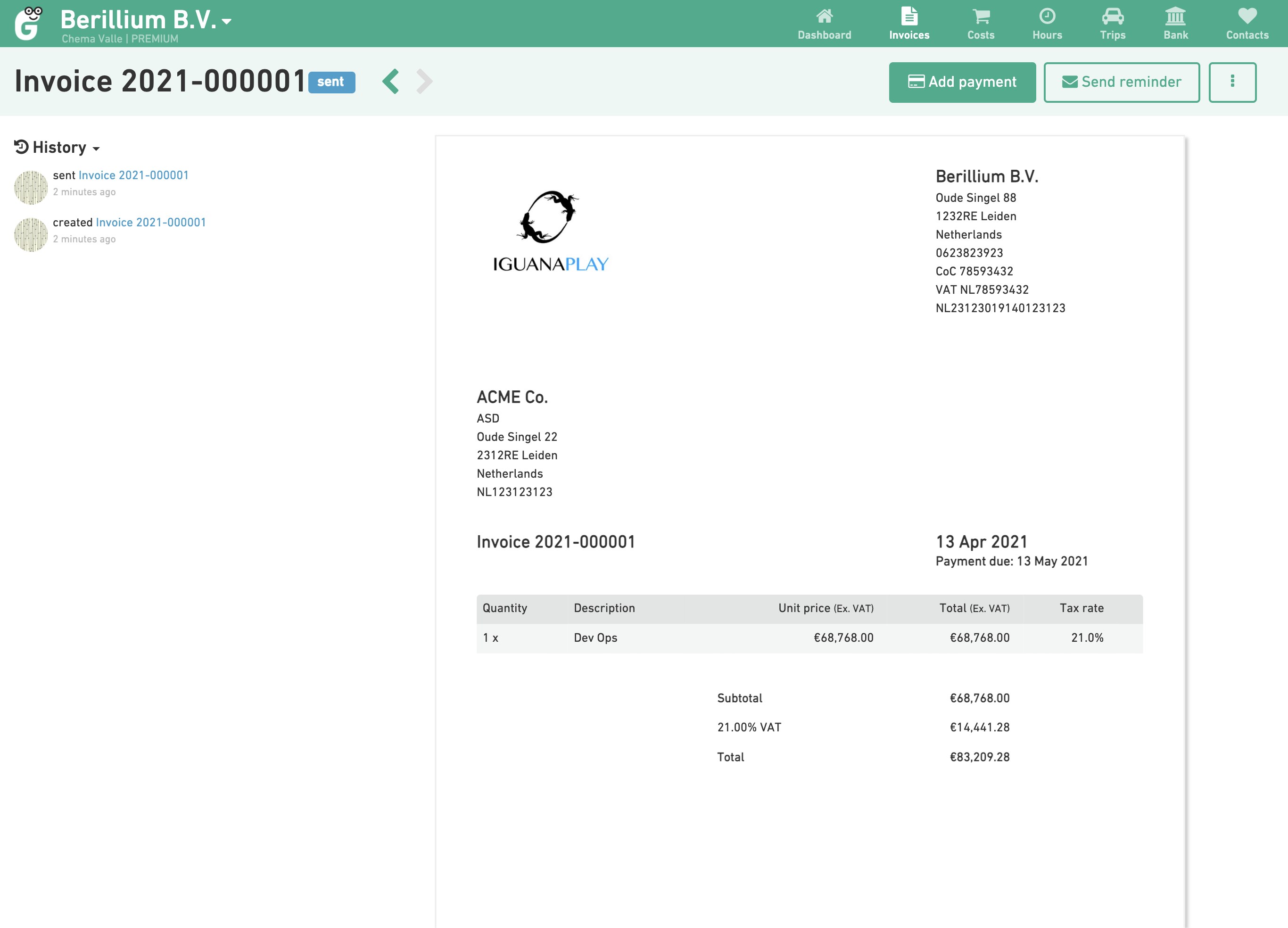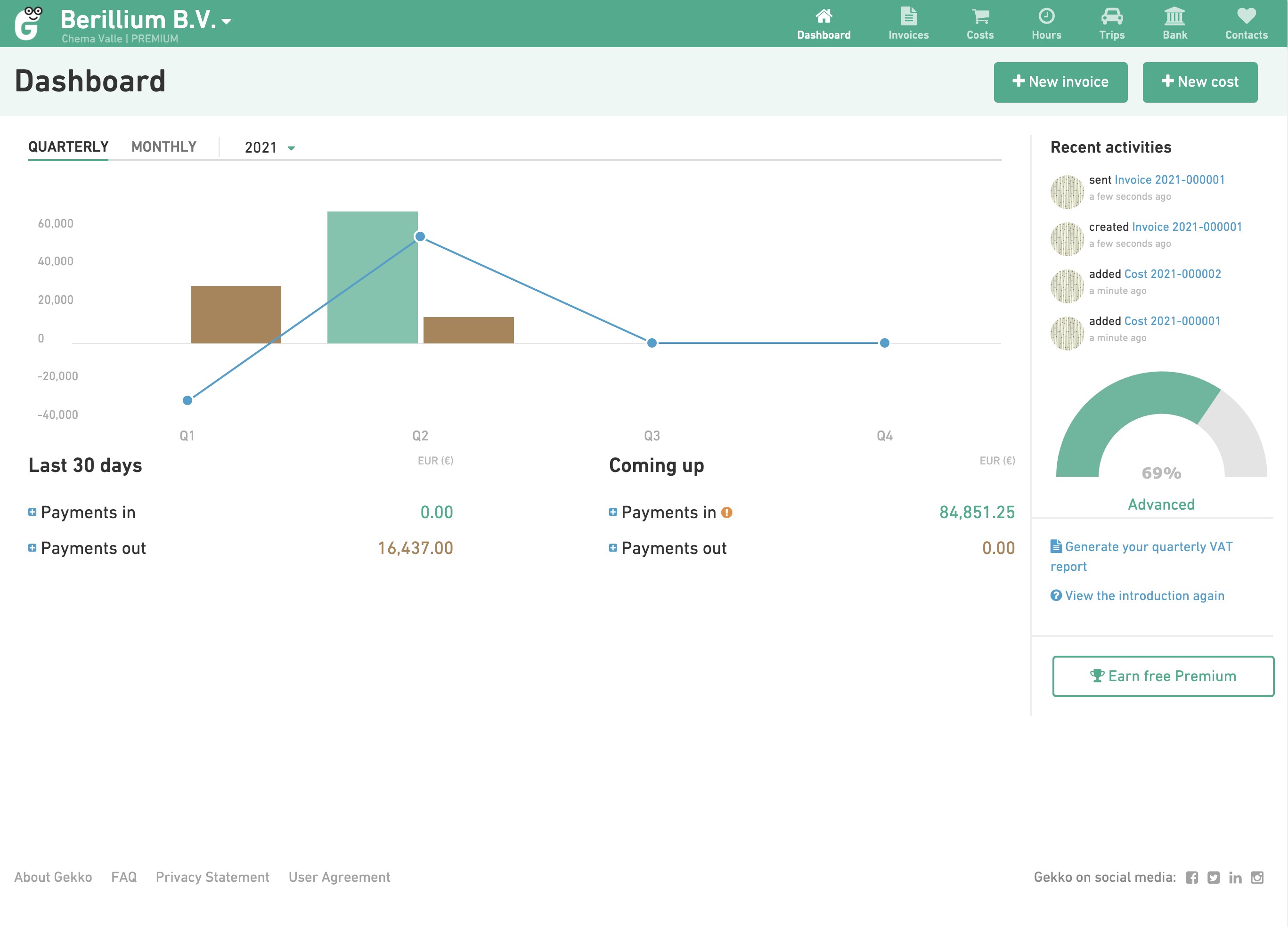 Gekko Accounting is THE online accounting tool for freelancers and other small entrepreneurs. Use the Gekko Accounting app to manage all aspects of your company records for free. Whether it is cost management, invoicing, hour registration, travel tracking or taxes, Gekko has you covered. Always a clear and complete overview of your business.