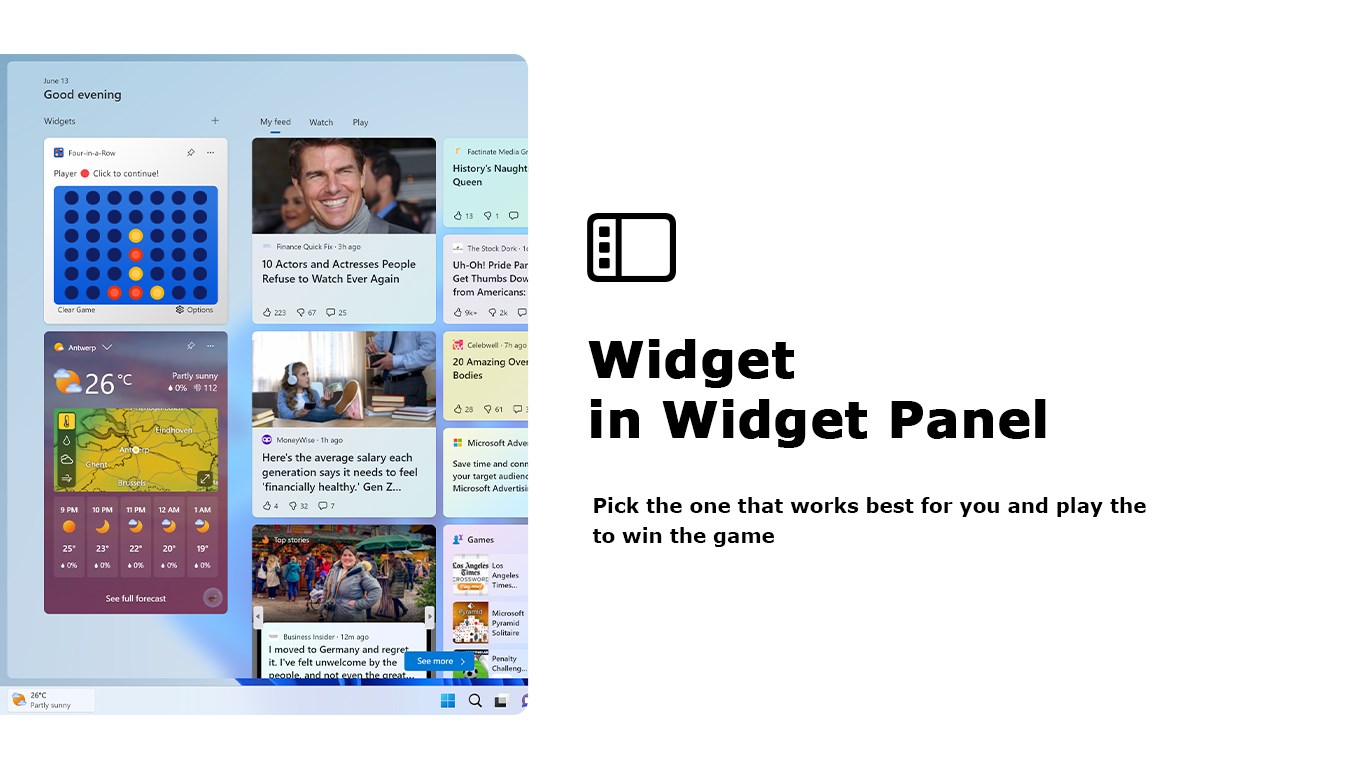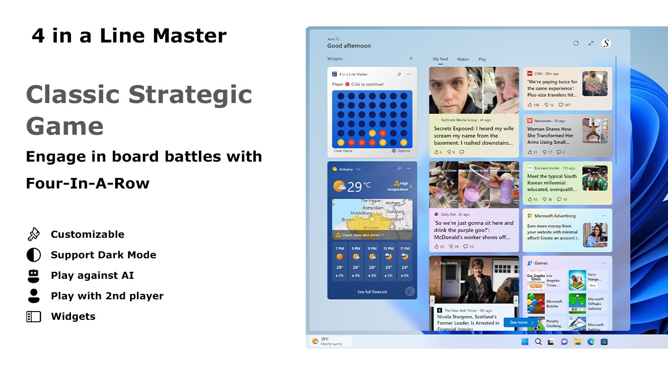 Introducing "Four-in-a-Row" - the ultimate Windows 11 widget for all fans of the classic game of strategy and wit! Also known as "4 Connect" or "Connect Four", this widget brings the timeless fun right to your fingertips, allowing you to challenge friends, family, or even the AI to thrilling matches of strategic gameplay.